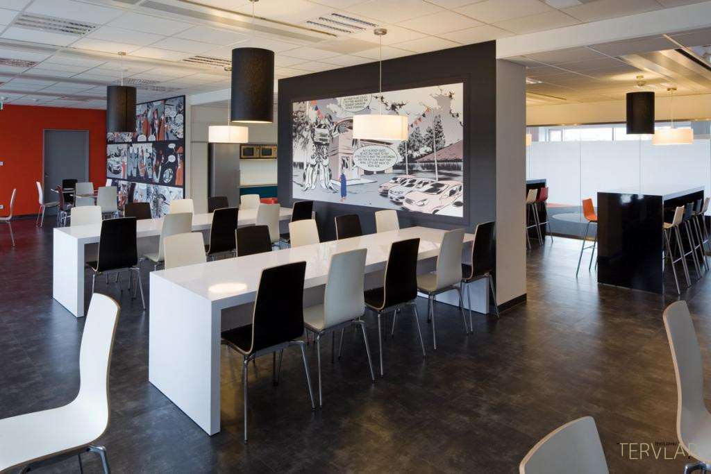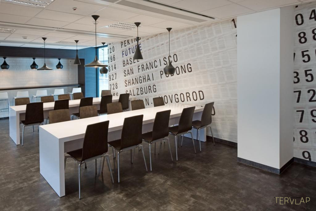 A storyboard, azaz a képregényen kirajzolódó történet, a cég munkatársai között kiírt nyertes pályaművet jeleníti meg. A vinil tapétára egyedileg nyomtatott storyboard, teljességében végigolvasható az egyik falon. A színes felületek finomítása érdekében – az étkezőasztalok felett fekete és fehér, hengeres alakú, egyedi tervezésű és gyártású, függesztett lámpatestek lógnak.