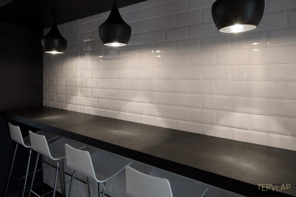 Sötétszürke, kőhatású LVT padlóburkolat található a helyiségben, mint a harmadik szint konyhájában. A sötétebb térelemek mellett – mint a kapumotívumot formázó, az étkezőpultot körülölelő, fahatású falburkolat – megfelelő ellenpontot képez a fehér színű, fényes, szögtöréses Metro csempe, mely megkönnyíti a fahatású, magas étkezőpult mögötti felület tisztántartását.