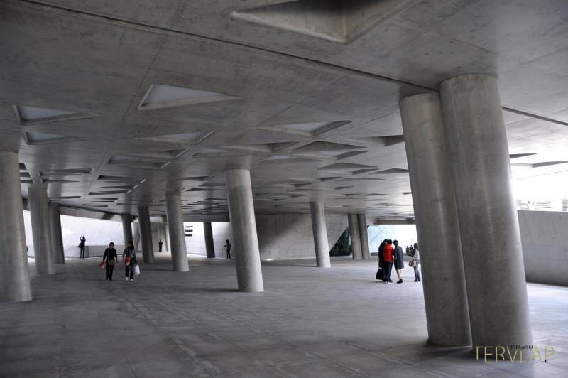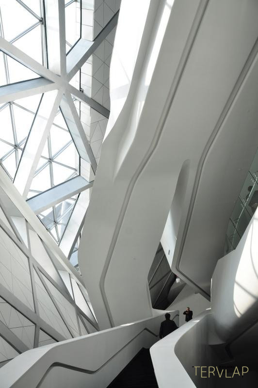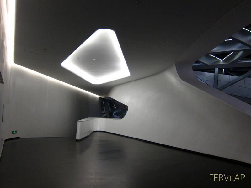 A lobbiba érve mindenki lázas lelkesedéssel készített fotókat, a látvány valóban lenyűgöző. A külső tértől hatalmas üvegszerkezet választ el minket, a belső kialakítás pedig telis-tele van a Zahára jellemző formákkal, ívekkel. Egyfajta letisztult fekete-fehér fényjáték jellemez minden részletet. Az építészeti nyelv a római MAXXI megnyitóján is hasonló volt, minimalista fekete-fehér fényjáték, de az ívek és formák Hadid régebbi korszakát idézték.