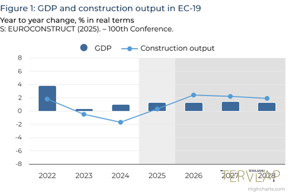 A jubileumi eseményt a BDO Advisory rendezte november 25-én Párizsban. A 100. Euroconstruct konferencián bemutatott új előrejelzés szerint két egymást követő évnyi zsugorodás után az európai építési piac idén az óvatos stabilizáció szakaszába léphet: 2025-ben egy szerény, 0,3%-os növekedés várható, jövőre egy észrevehetőbb, 2,4%-os bővülés jöhet.