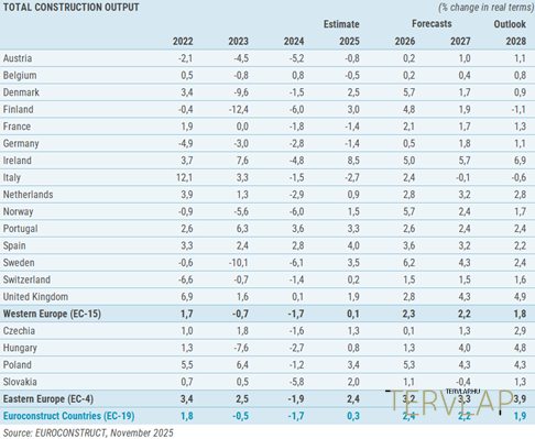 Az új előrejelzésben az Euroconstruct – a 2023-as (-0,5%) és 2024-es (-1,7%) csökkenés után fokozatos fellendülést prognosztizál a teljes építési teljesítményben. A javuló pénzügyi feltételek, a hosszú távú infrastrukturális programok és a fenntartható felújítás iránti kereslet kombinációja várhatóan segít az ágazat stabilizálásában idén és támogatja majd a növekedést 2026-tól kezdődően. Az egyik legegyértelműbb üzenet a növekedés összetételének eltolódása: az új építés és a mélyépítés lesz egyre inkább a ciklus mozgatórugója 2025-től, míg a felújítások, melyek továbbra is stabilak, kisebb bővülési szakaszba lépnek a költségvetési korlátok szigorodásával és a főbb támogatási programok visszafogásával. A teljes építési teljesítmény 2027-re meghaladhatja a 2023-as szintet, bár a fellendülés továbbra is egyenetlen és ki van téve a folyamatos gazdasági bizonytalanságnak.