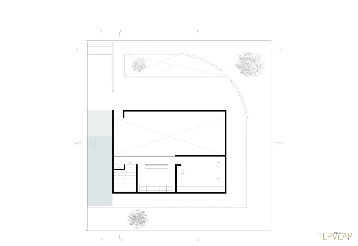 - Az alsó szint tömör podesztként viselkedik: itt találhatók a hálószobák, a garázs és a kiszolgáló helyiségek.