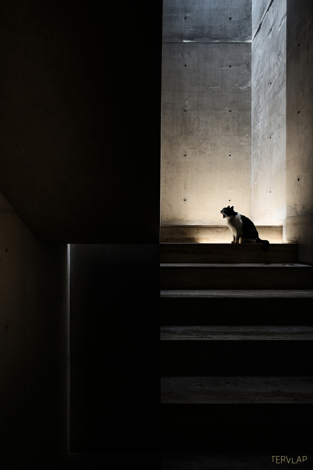 „Szerettük volna, ha az anyagban leülepedik a fény, ahelyett, hogy visszaverődne" – hangsúlyozták az építészek. A nyílások és üvegezések mélyen hátrahúzódnak a falakban, az eltolt homlokzati síkok révén a belső terekben inkább lágy penumbra* (félárnyék) alakul ki, mint direkt erős fény. Az árnyék nem csak hő- és fénycsökkentő szerepet játszik, hanem egyben atmoszférikus fókusz is: az épület belső világa meditatív, megállásra ösztönző karaktert kap.