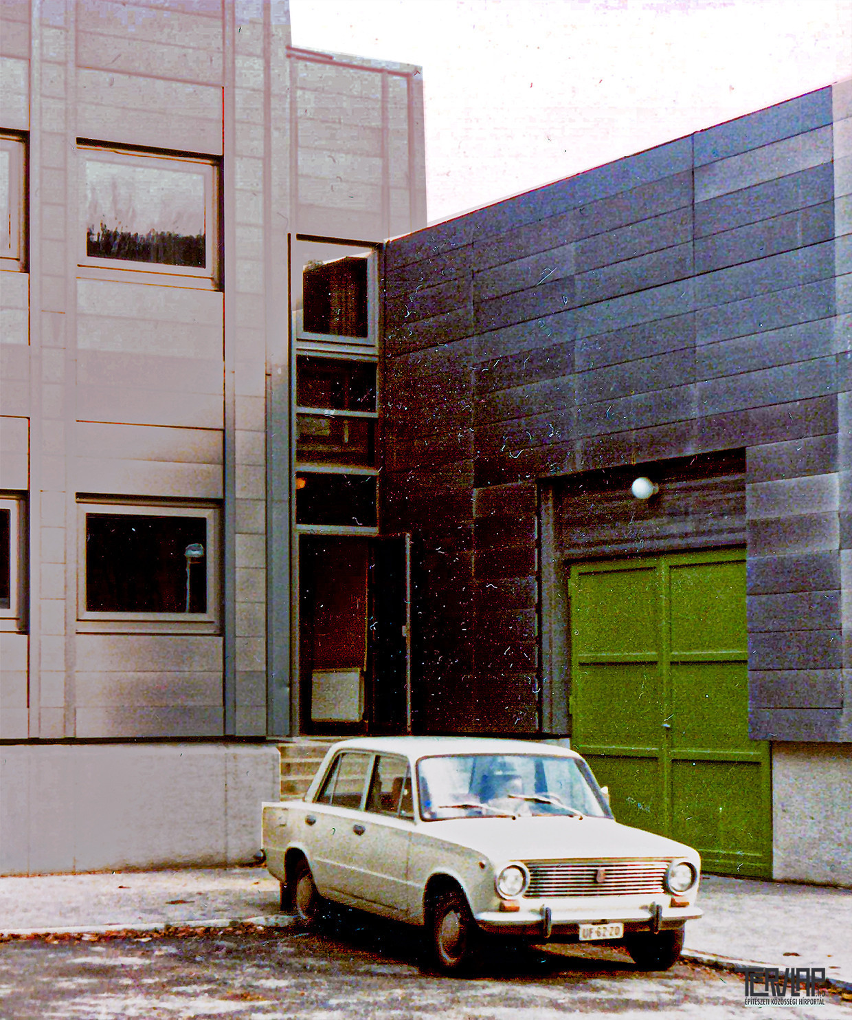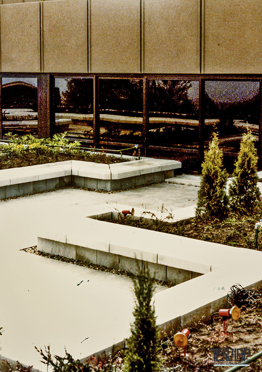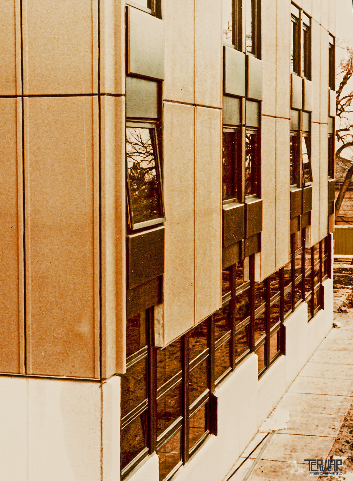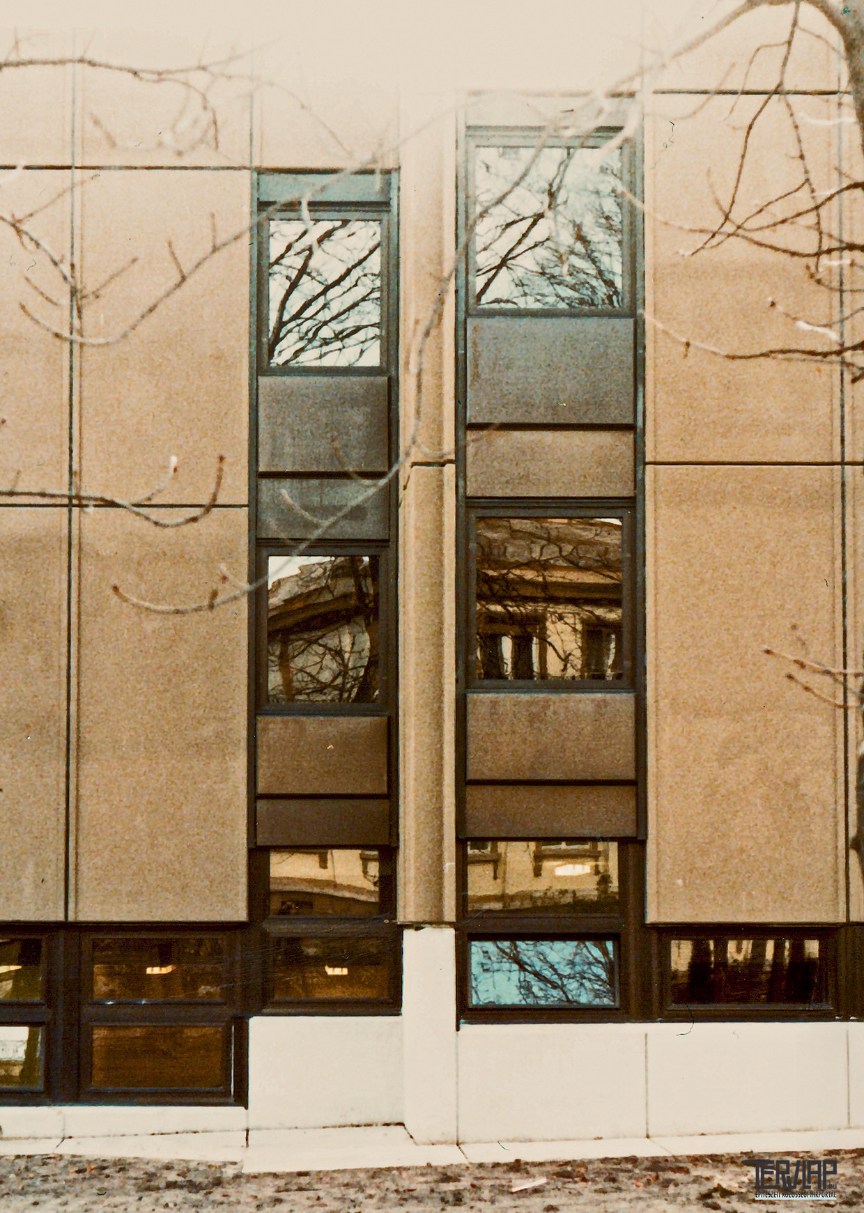 A külső megformálása nem esztétikai kérdésként merült fel, hanem erkölcsi és funkcionális döntésként. A Scan-Form zsaluzattal készült vasbeton váz adott volt: feszes raszter, pontos szerkezeti logika, amely önmagában is fegyelmet sugalt. A kérdés az volt, milyen homlokzat illik ehhez a szerkezethez úgy, hogy az ne áruljon el semmit abból, ami mögötte történik. Nem reprezentálhatott, nem hívhatott, nem jelezhette, hogy ez egy kivételes rendeltetésű épület. A homlokzat feladata az lett, hogy elfedjen, tompítson, visszafogjon.
