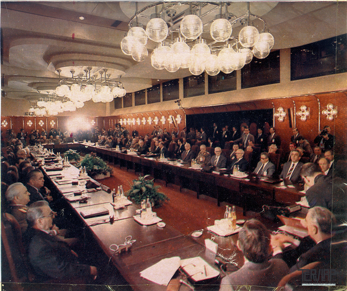 A belső terek szervezésének középpontjában a plenáris terem állt. Reprezentatív világítást kapott, ugyanakkor eseti hangulatvilágítással is szabályozható volt. A tanácskozást fentről tolmácsfülkék, lent az egyedileg tervezett, forgatható székek és az akusztikailag kezelt felületek mind azt szolgálták, hogy a tárgyalás egyszerre legyen kényelmes, pontos és érthető.