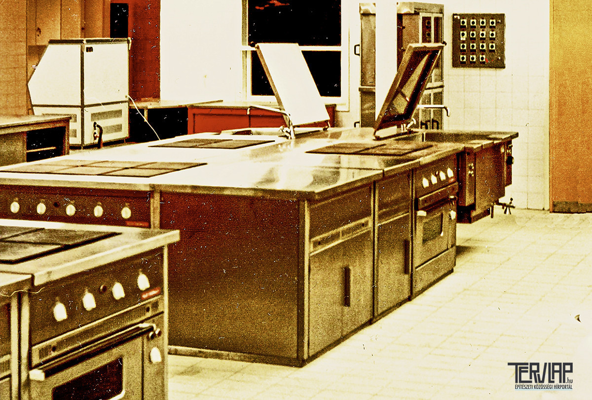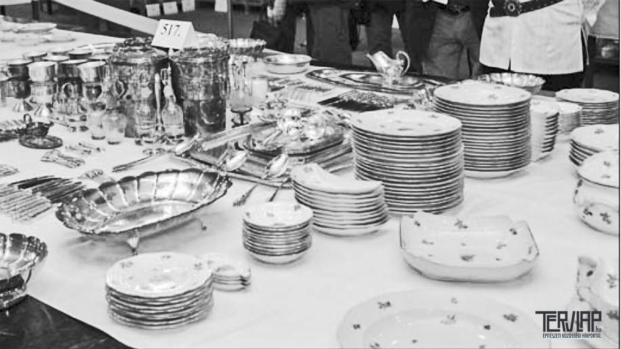 A épület egyik legbeszédesebb tere végül a konyha volt. Nem reprezentációs tér, nem látható homlokzat, hanem a működés magja. Itt dolgozott az a technológia, amelynek pontosnak, gyorsnak és észrevétlennek, szagtalannak kellett lennie – ugyanúgy, mint az egész háznak. Az ipari konyha berendezései a kor legkorszerűbb szintjét képviselték, az asztalokra pedig zöld Apponyi mintás herendi készlet került. Ez a tárgyegyüttes – amelyet 2007-ben már külön, egy árverésen értékesítettek – ma talán csak porcelánként létezik tovább. Akkor azonban a ház rendjének része volt: annak a világnak a kelléke, amelyet meg kellett teremteni, de nem volt szabad megmutatni. Amikor ezek a tárgyak elkerültek innen, valójában nemcsak egy készlet tűnt el, hanem a ház egyik utolsó, kézzelfogható emléke is.