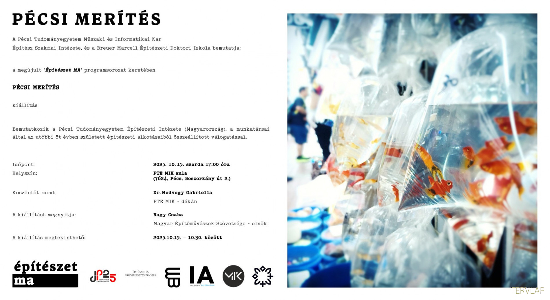 Október 15-én rögtön három eseményt is rendeznek a karon: az egyik a DesignPécs 2025 rendezvénysorozathoz kapcsolódóan egy eddig Magyarországon még be nem mutatott kiállítás, a Pécsi Merítés, amely a kar Építész Intézete oktatóinak az elmúlt öt évben megvalósult munkáiból nyílik. A szigorú szelekció mentén válogatott építészeti alkotások az „egy projekt–két fotó” rendezőelvet követik, és minden pályázótól csak egyetlen munkát válogattak be. Az anyag a közelmúltban a PTE MIK kínai egyetemi partnerkapcsolatai révén már bemutatkozott Vuhanban, illetve Pekingben, ahol pozitív szakmai visszajelzést kapott. „A kiállítás a mögöttünk hagyott öt év egyfajta értékelése, lenyomata. Nekünk, az egyetemhez kötődő építészeknek megoszlik a fókuszunk. Sokaknak van építészeti praxisa megvalósult épületekkel, mások fejlesztési koncepciókban, tervpályázatokban vagy konstruktőri területeken erősebbek, megint másoknak az akadémiai kutatói munkásságuk láthatóbb – természetesen az oktatás, tehetséggondozás mellett. Nem volt egyforma ez az intervallum a feladatok sűrűségét tekintve a piacon sem, hiszen még a Covid világjárvány is belelóg. Máshonnan nézve: a 30 projekt bemutatása egyben az egyetemi oktatók megünneplése, hiszen ők a szakmagyakorlási jogosítványaik mentén felhalmozott értéket teremtenek, és az ebből merített tapasztalatnak értékes helye van az oktatásban. Van, aki belsőépítészeti vagy egy lakásátalakítás anyagát hozta, de szerepelnek komoly középületek is, mint a Misina TetőPont családi és mozgástér vagy a pécsi vásárcsarnok, több projekt pedig kilép a régió keretei közül, sőt nemzetközi színtérre is kitekint” – mondja dr. Medvegy Gabriella, a PTE MIK dékánja, aki azt is hozzáteszi: élénk nemzetközi érdeklődés övezi a kiállítást, amely hamarosan Rómában és Zágrábban is látható lesz.