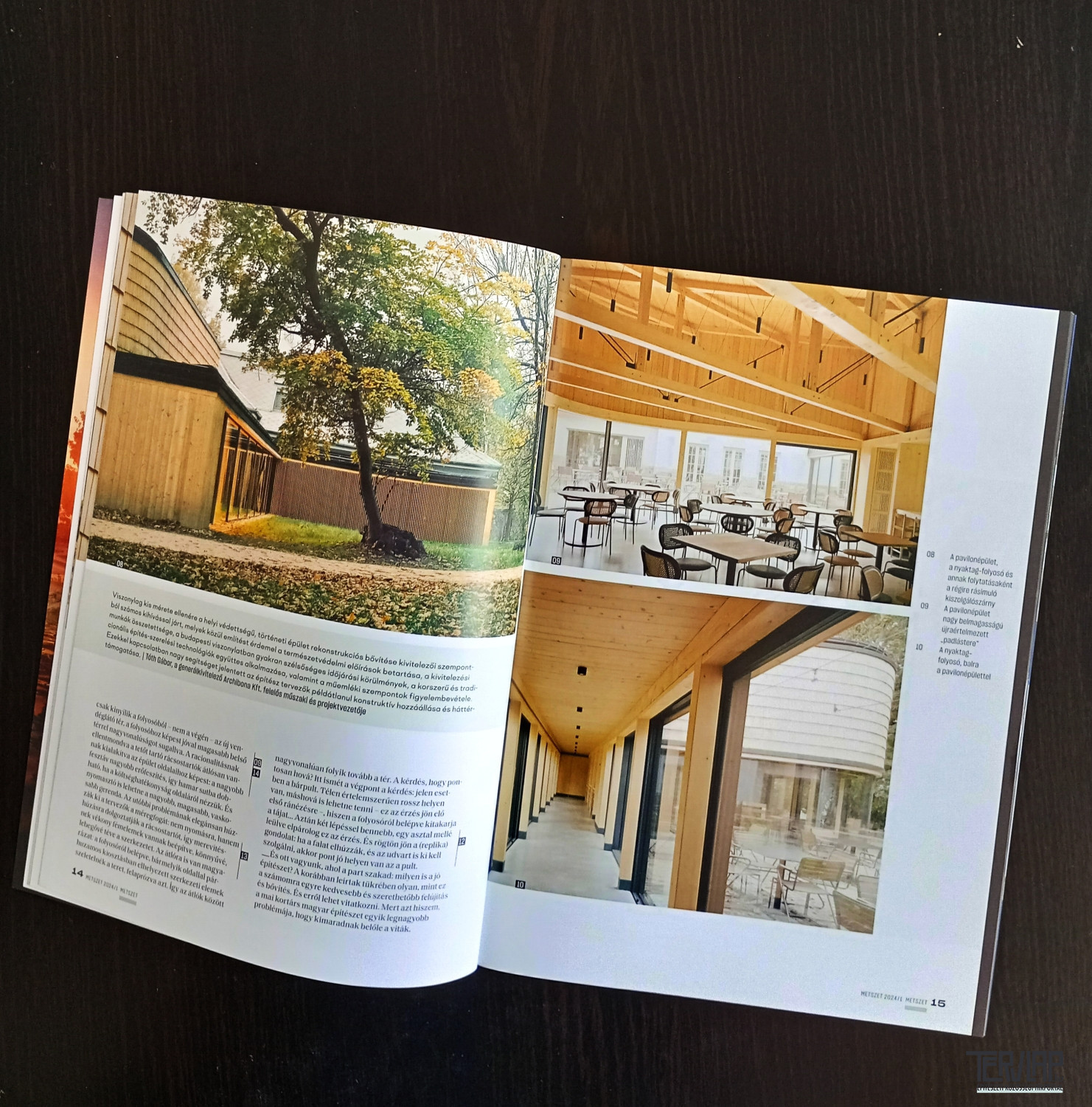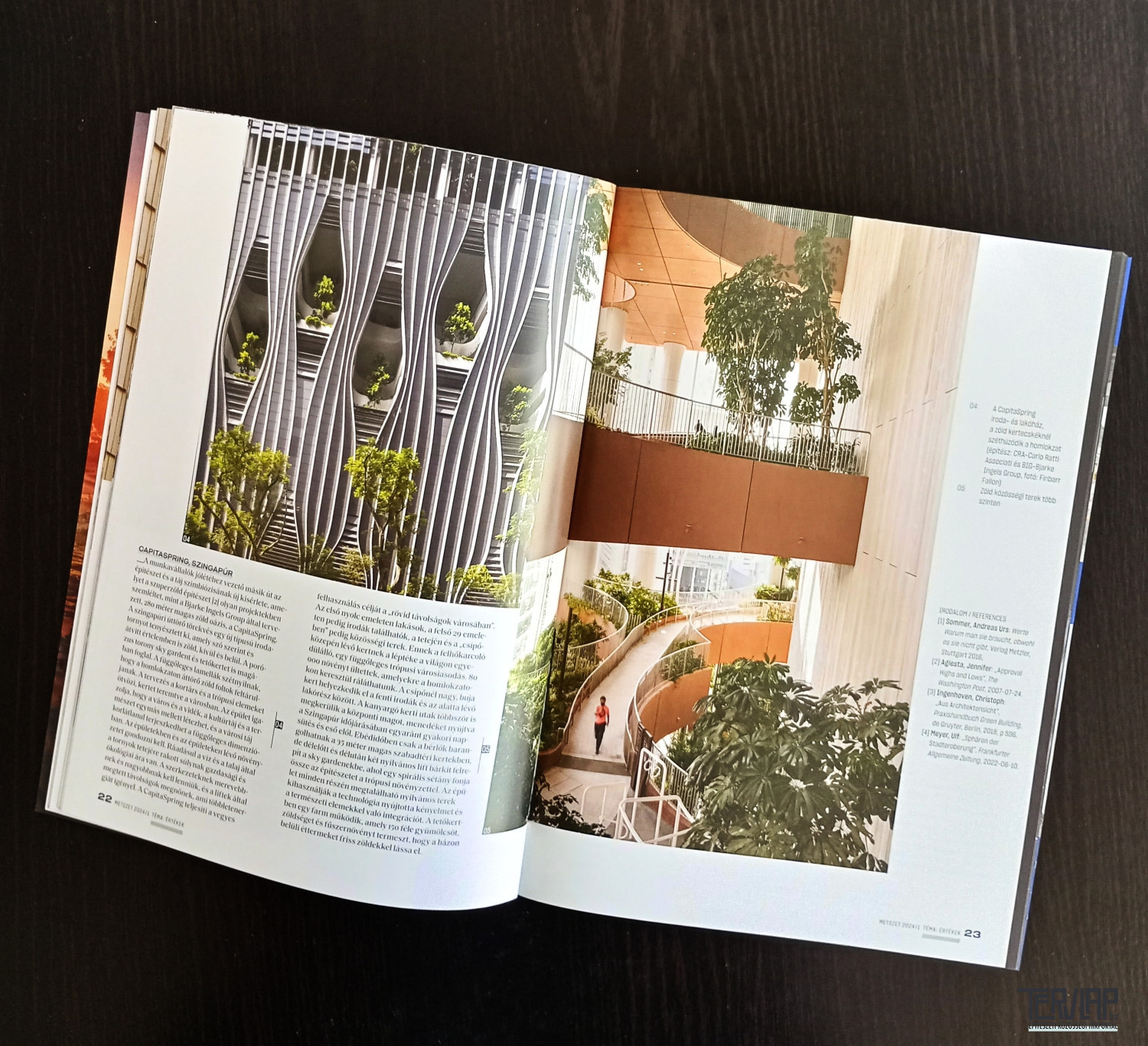A Zöld Oldalak rovatban a HuGBC gondolatait olvashatjuk az értékalapú építészet és a zéró karbon törekvései közötti kapcsolatról, az a_pro' rovat ezúttal Veszprémbe kalauzolja az olvasót, és a Hello Wood koncepciója alapján, az EKF 2023 keretén belül megvalósult "Garden of Communities" építményt mutatja be. A Mai szemmel rovatban egy megszokottnál fiatalabb épületet ismerhetünk meg, Reimholz Péter balassagyarmati iskolaépülete mai fogalmaink szerint építési idejét (1984-89) és megjelenését tekintve sem számít még igazán réginek, de ez az épületválasztás felhívja a figyelmet arra, hogy már a '80-as években épült házak is 35-40 évesek, így felújításuk, funkcióik, belső tereik újragondolása mindenképpen időszerű.