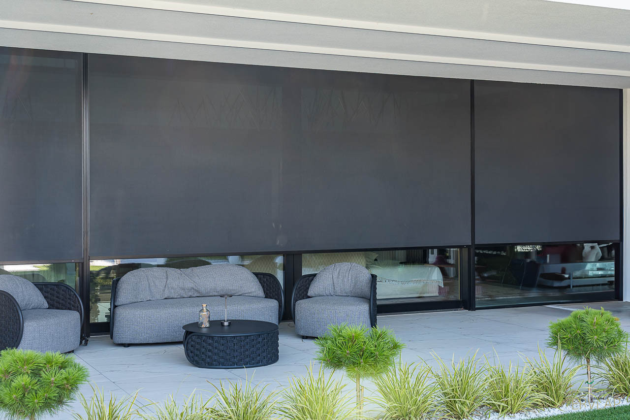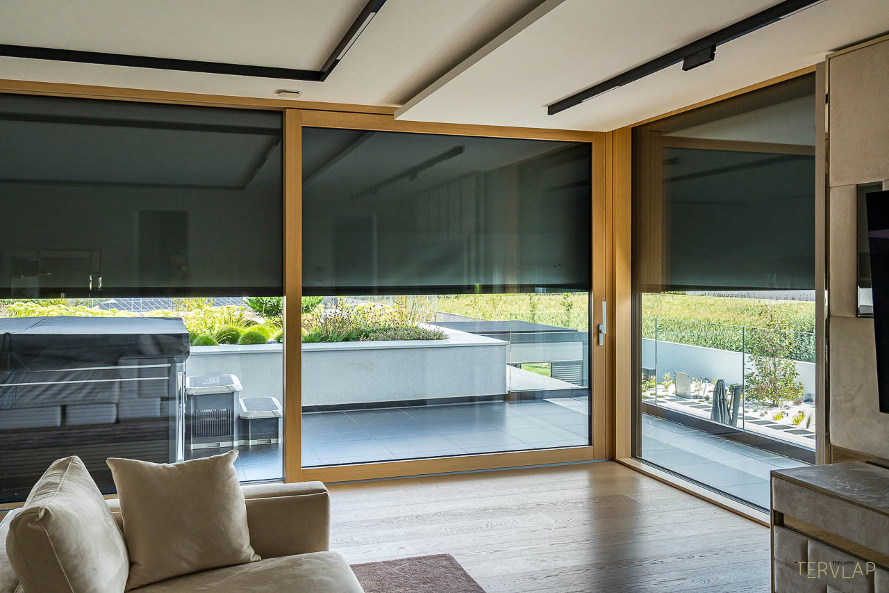 A villa üvegfelületeinek árnyékolására a Fixscreen Minimal IM7 ZIP-rendszert választották, melynek különlegessége, hogy tokjai és lefutósínjei teljesen rejtve kerültek beépítésre. A nappaliban például egy 10 méter hosszú, 3 méter magas, középen nyitható nyílászáró előtt is ez a rendszer biztosítja a napvédelmet – olyan visszafogott esztétikával, hogy az árnyékoló felhúzott állapotban gyakorlatilag láthatatlan.
