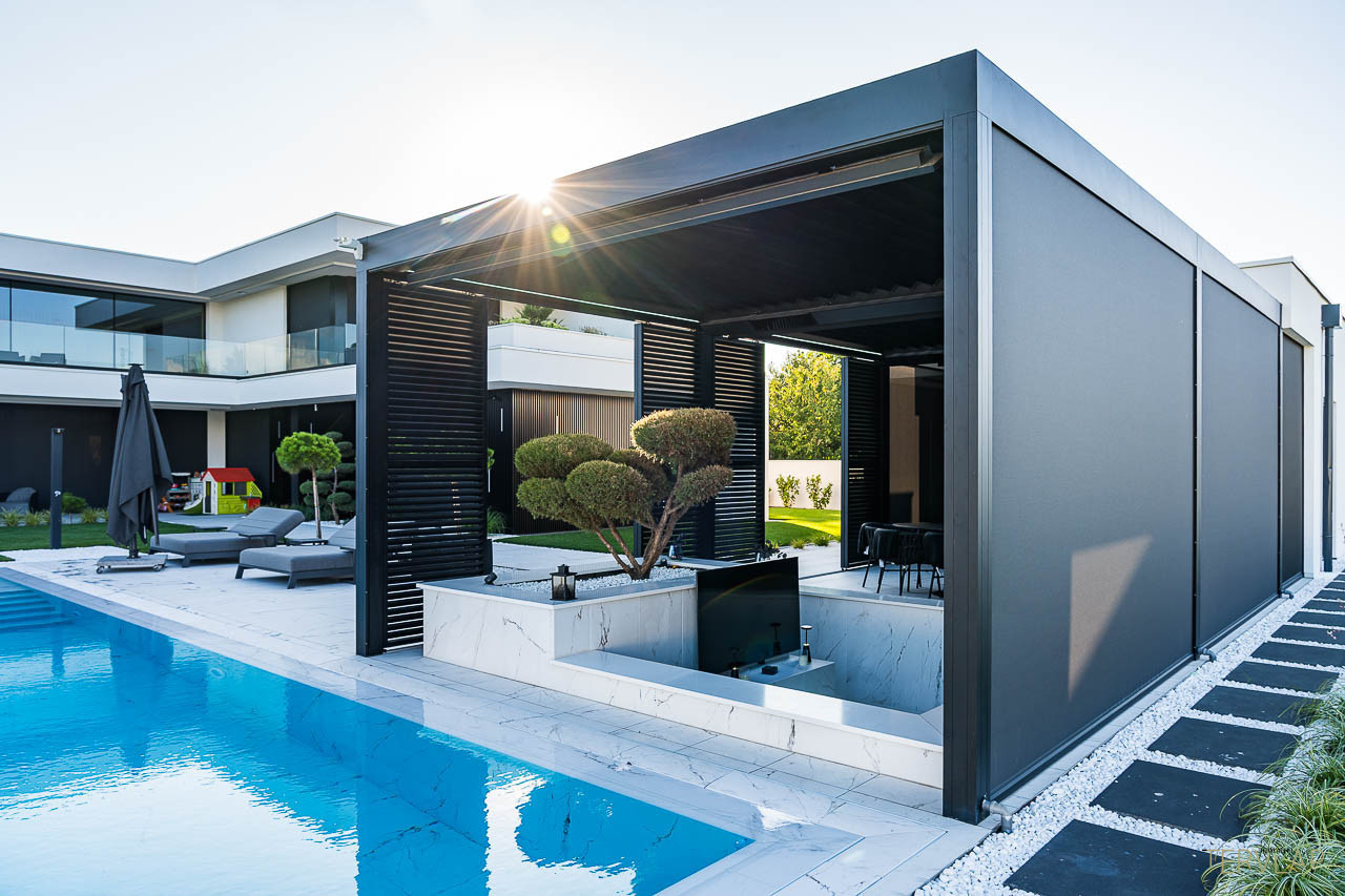 A villa kertjének egyik kulcseleme a kétmezős, kapcsolt Camargue bioklimatikus pergola, amely egész éves kültéri használatot tesz lehetővé. A 150°-ban forgatható lamellák szabályozzák a fényt és a szellőzést, miközben az oldalzárások terén is kiemelkedő megoldás született: Fixscreen textilárnyékolók és mozgatható lamellás tolózsalugáterek egyaránt beépítésre kerültek, elegáns, integrált módon.