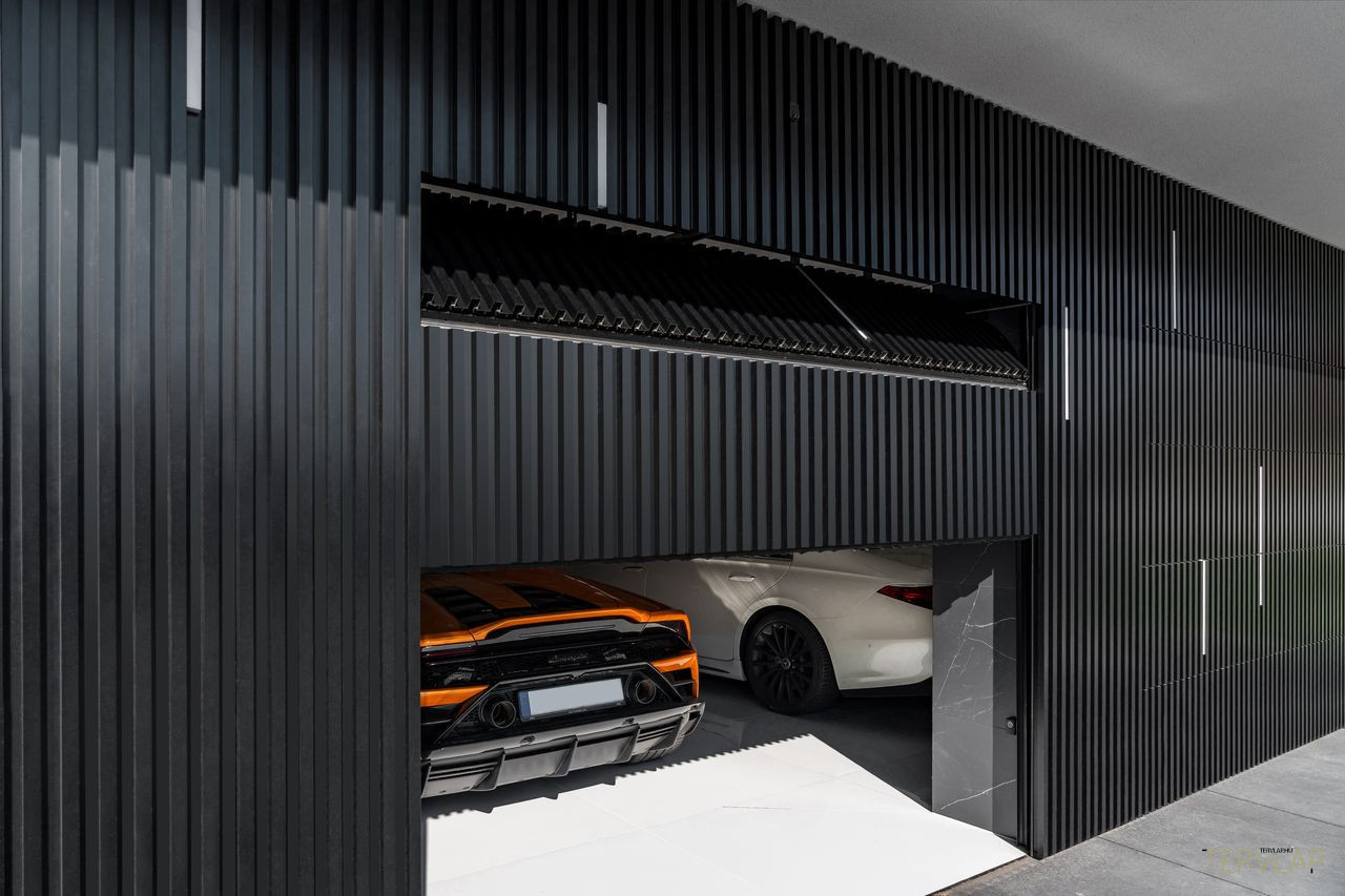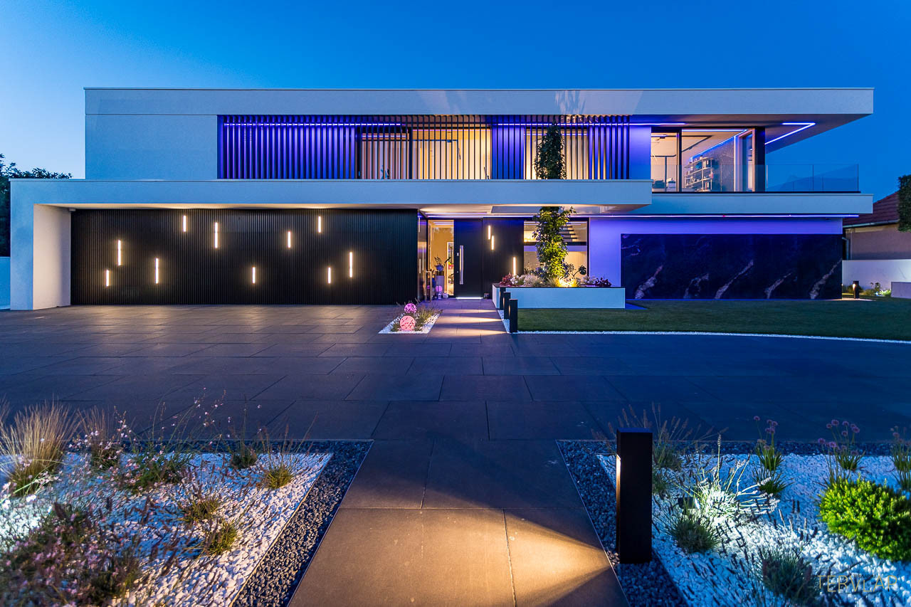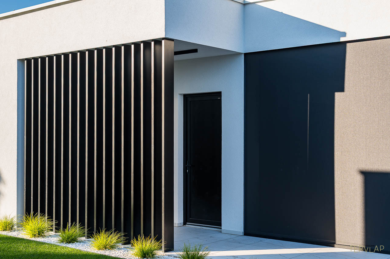 A villa arculatát két domináns homlokzati rendszer határozza meg. A Linarte vertikális alumínium burkolat nem csupán látványelem, hanem építészeti funkciót is betölt: az épület tömegét ritmikusan tagolja, miközben az egyénileg variálható integrált LED világításnak köszönhetően sötétedés után is hangsúlyosan jelen van. A zárt állapotban szinte láthatatlan, integrált garázskapu és a homlokzattal összeolvadó kerítéselemek is ebből az anyagból készültek, így az egységesség minden részleten átível.