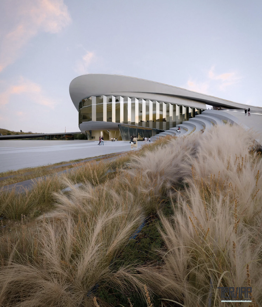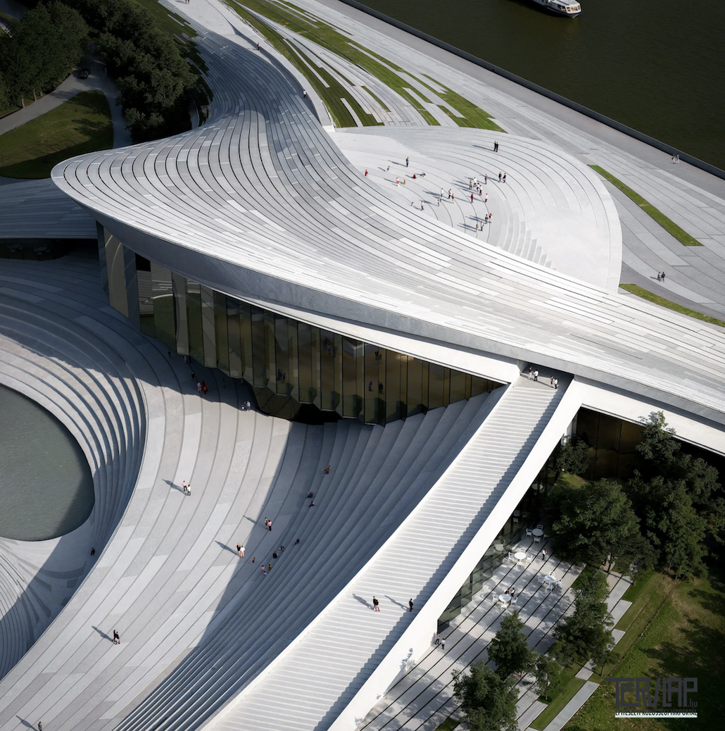 Az épület kialakítását a híd áramló formái és összekötő funkciója ihlette, ezért a tömeg két, hullámszerű térfogatból áll. Ez a dinamikus konfiguráció nemcsak valamennyi közlekedési útvonalat egy központi csomópontba fűzi össze, hanem egy élénk, nyitott közösségi teret is létrehoz. A hullámzó táj, az árapály ritmusához hasonlóan, felfedező útra vezeti a látogatókat a helyszín szívében álló kapu felé, majd tovább egy panorámás tetőteraszra, ahonnan a folyóra és a városra nyíló átfogó kilátás tárul fel, életre keltve a két vízi út közötti közösségi teret. A meghatározó elem a kanyargó útvonalrendszer, amely a tájat az épület belsejébe vezeti. Észak felé kényelmes sétányok haladnak át a festői folyóparti tájon egészen a tetőszinti városi panorámáig. Kelet felé hídszerű gyalogos utak kapcsolódnak zökkenőmentesen a városi környezethez, majd vezetik át a látogatót a művészeti múzeumba, lehetővé téve, hogy lépésről lépésre emelkedjenek a víz és az ég felé.