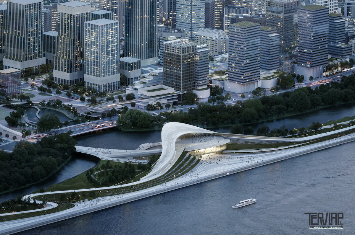 A Snøhetta terve amorf épített tájjal terjeszti ki a városközpontot, új promenádot hozva létre a folyóparton.