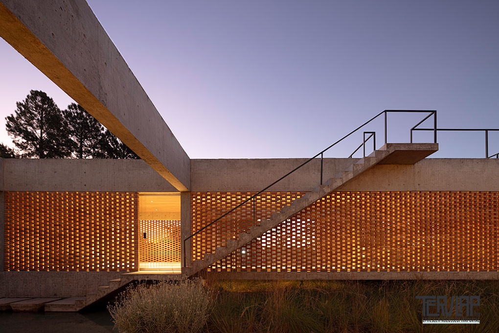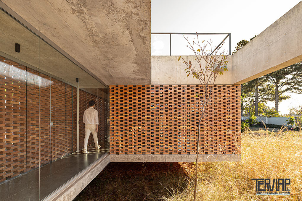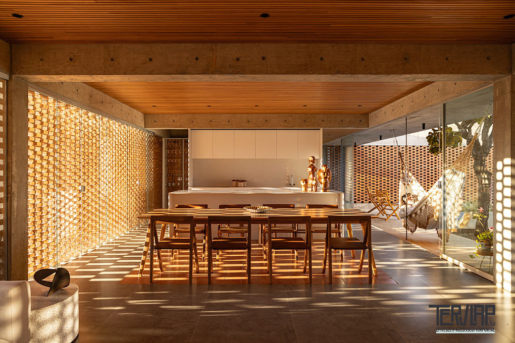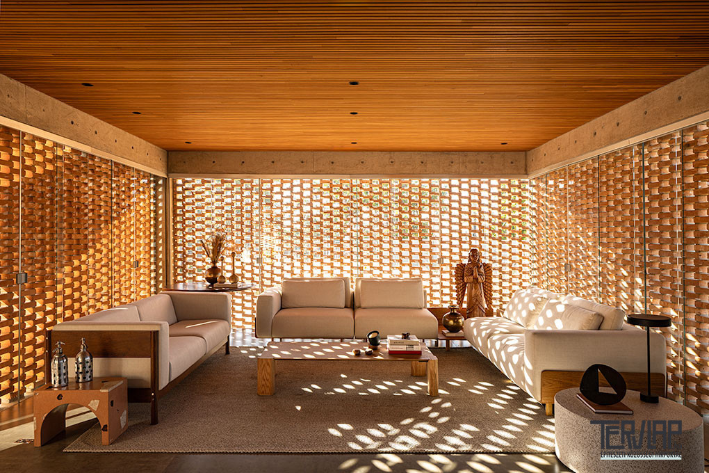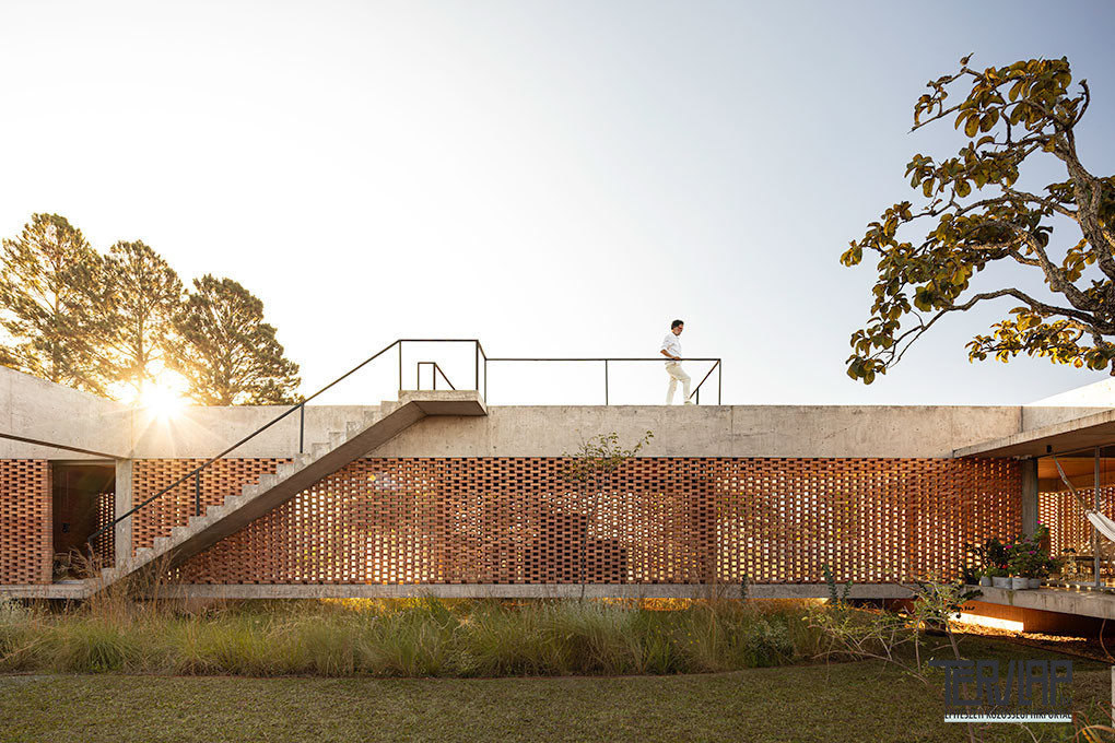 A Brazília fővárosától 20 kilométerre épült Tupin House épületszerkezetei a maguk természetes nyerseségében jelennek meg. A nagy üvegfelületek helyett a megemelt betonfödém és a mély tetőszerkezet közötti függőleges síkok korallszínű téglából készülnek, tömör falakként vagy áttört, zsaluszerű elemekként kialakítva, amelyek textúrával és szűrt fénnyel burkolják körbe a házat. Belül a mennyezeteket természetes fával burkolták, ezzel oldva a szerkezeti anyagok keménységét.
