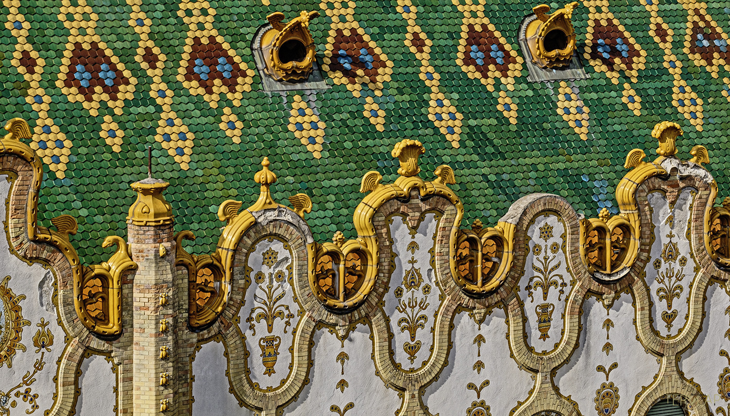 A színes mázas kerámiák, a páva-, bika- és virágfigurák a magyar népi ornamentika és a keleti szimbolika találkozásai. A Zsolnay-gyár Lechner igényei szerint fejlesztette ki a pirogránitot, amely egyszerre volt szerkezeti és spirituális anyag. A máz nem pusztán védőréteg, hanem fény, amely az ég felé tükrözi a mesterség dicséretét. „A tető az ég felé fordított homlokzat.” (Sisa, 2014, p. 128) Lechner törekvése nem a népi motívumok másolása volt, hanem azok szellemi újrafogalmazása – a virág, a tulipán, a pávatoll a magyar identitás építészeti jelképeivé váltak. A dísz itt gondolat, a motívum értelem: a tető így lett a nemzeti forma szimbóluma.