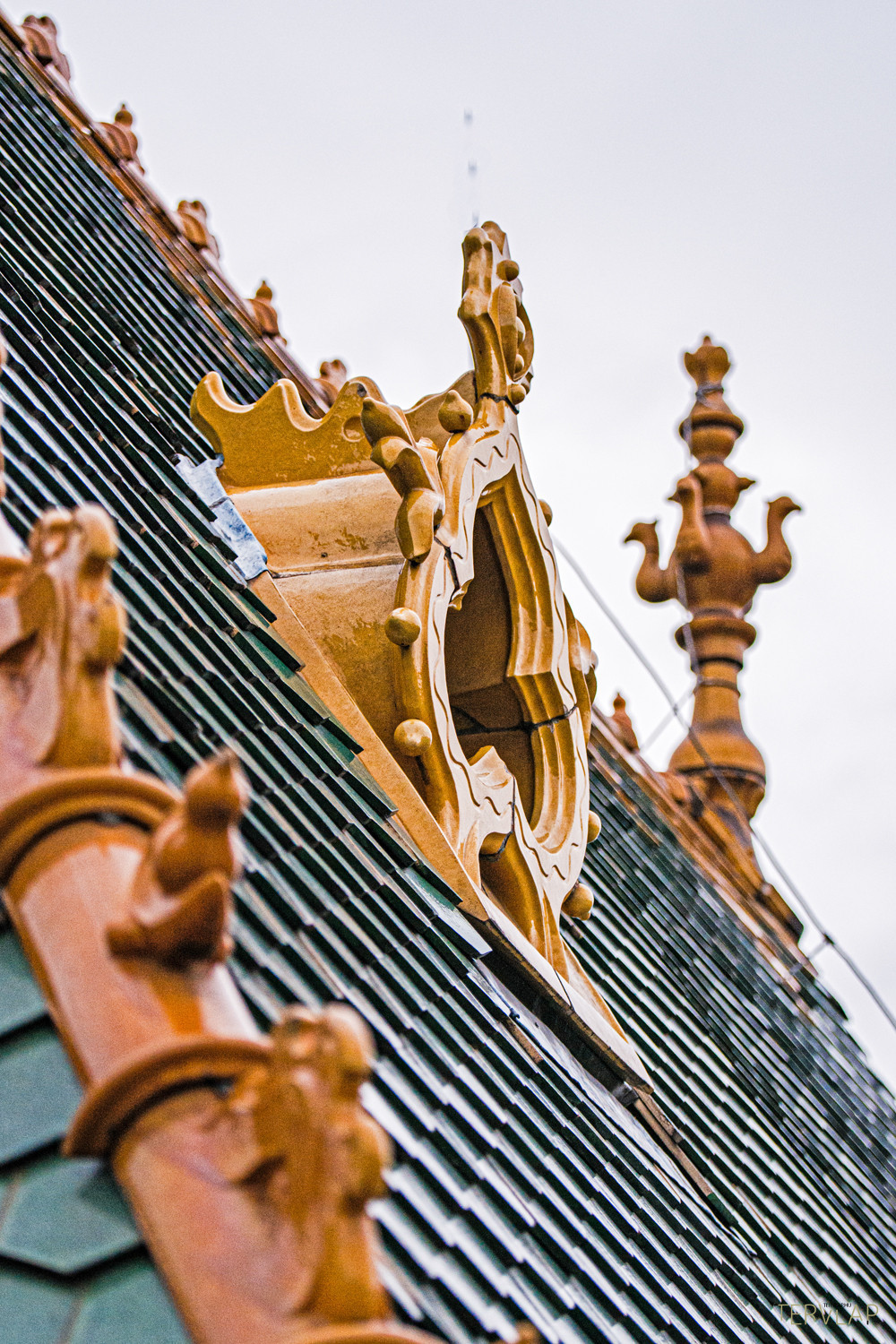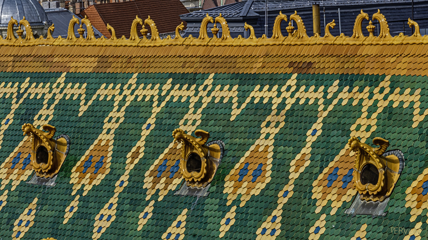 A fényképek a szerző felvételei: Földtani Intézet, Iparművészeti Múzeum, Postatakarékpénztár tető- és motívumrészletek, 2025.
