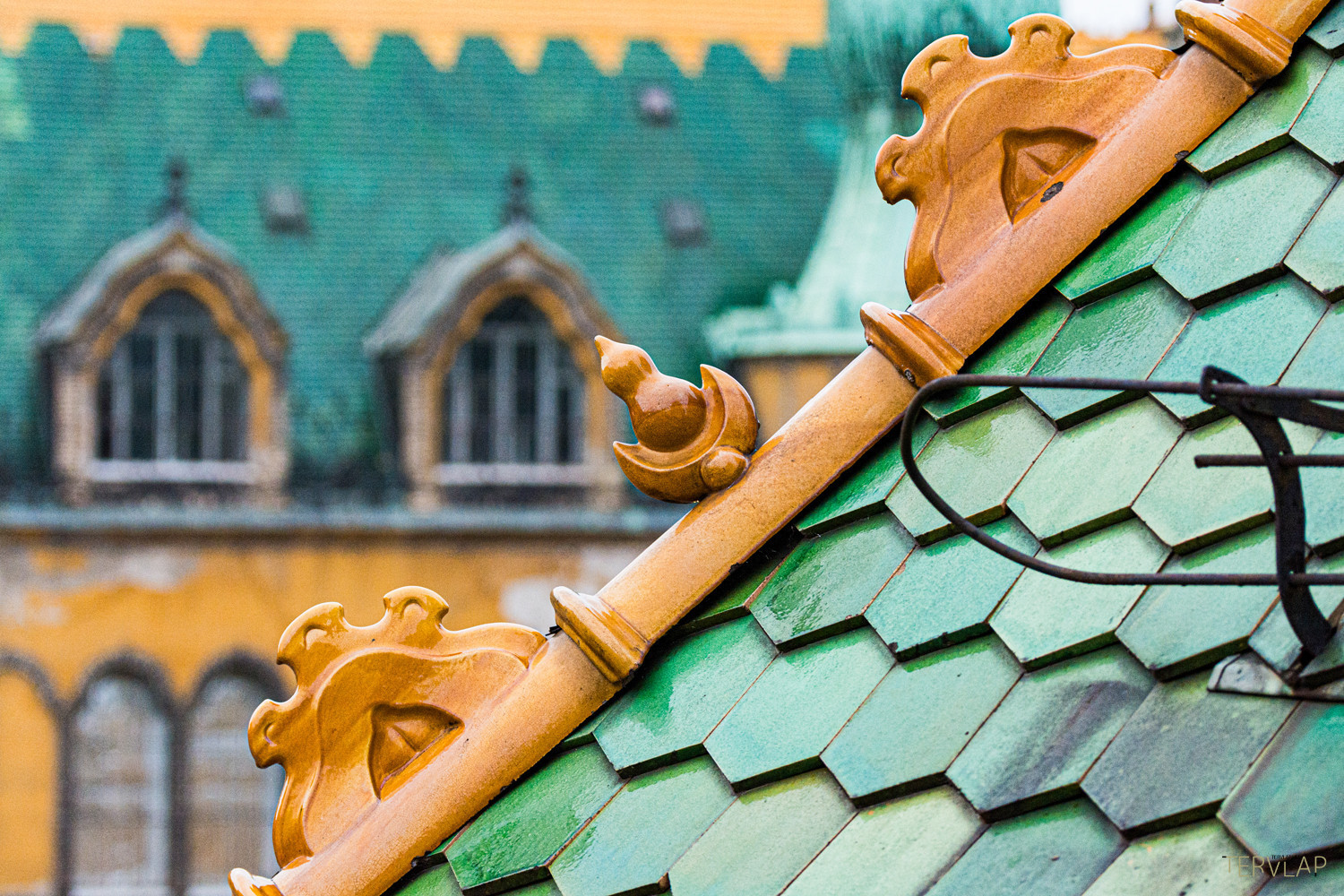 „A tetőélek és gerinccserepek sárga zománcozott pirogránitból valók.” (Építő Ipar, 1898) E két épületben a tető nemcsak lezárás, hanem elv: a magyar ornamentika és a modern technika találkozása. A máz és a forma együtt vall arról, hogy a szépség csak akkor igaz, ha az anyag is szolgálja a gondolatot.