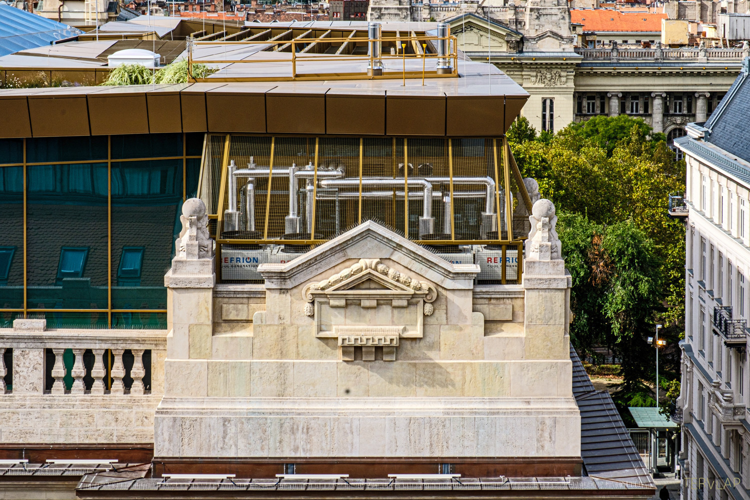 A 21. század városa már más anyagból épít. A fotók tanúsága szerint a díszt felváltotta a cső, a ritmust az acél, a motívumot a gépészet. A bronz- és alumíniumtetők már nem felfelé szólnak, hanem a funkció felé hajolnak. A Lechner-féle ornamentika mára nyelvi emlékké vált: még értjük, de már nem beszéljük. Mégis: a Zsolnay-cserepek, a pávatollas párták és a kék máz még mindig fényt tükröznek az égből. A város fölött, ahol ma szellőzők és napelemek állnak, a Lechner-tetők csendesen idézik a régi hitet: az anyag beszélt – és nem hazudott.