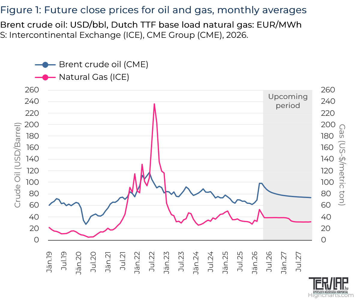 Az első ilyen a földgázár, mely sokkal fontosabb az alapvető építőanyagok (cement, tégla, üveggyártás) szempontjából. A gáz ára továbbra is 40 EUR/MWh körüli, az idén márciusban tapasztalt rövid csúcs után, és ez a 2022-es válságszint töredéke (csúcs: 339 EUR/MWh, éves átlag: 133 EUR/MWh). Amíg a gázpiacok viszonylag nyugodtak maradnak, az építőanyagárakra való áthárítás sokkal korlátozottabb lesz, mint 2022-ben. Másodszor, az olaj határidős görbéje azt mutatja, hogy a piacok a jelenlegi áremelkedést átmenetinek tekintik.