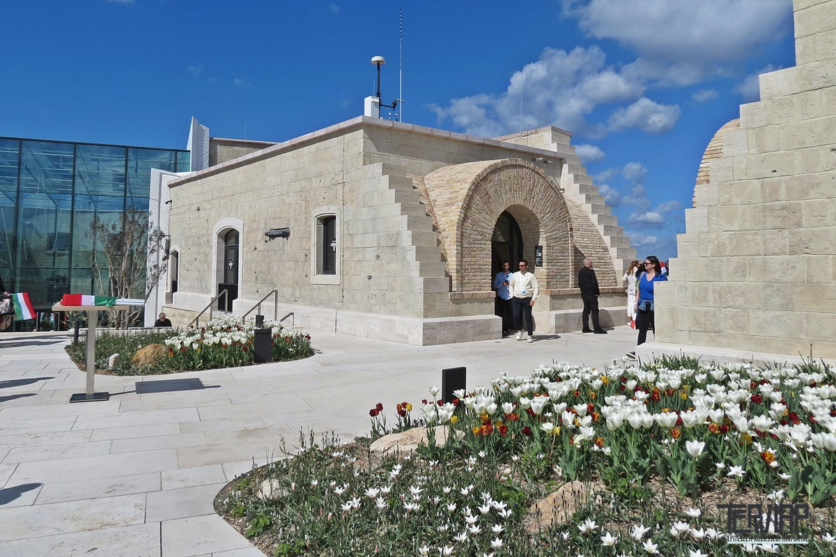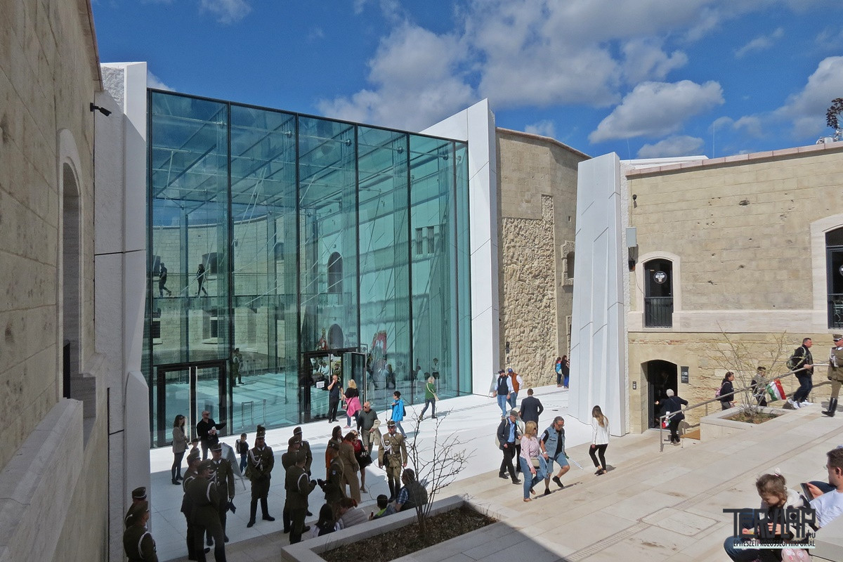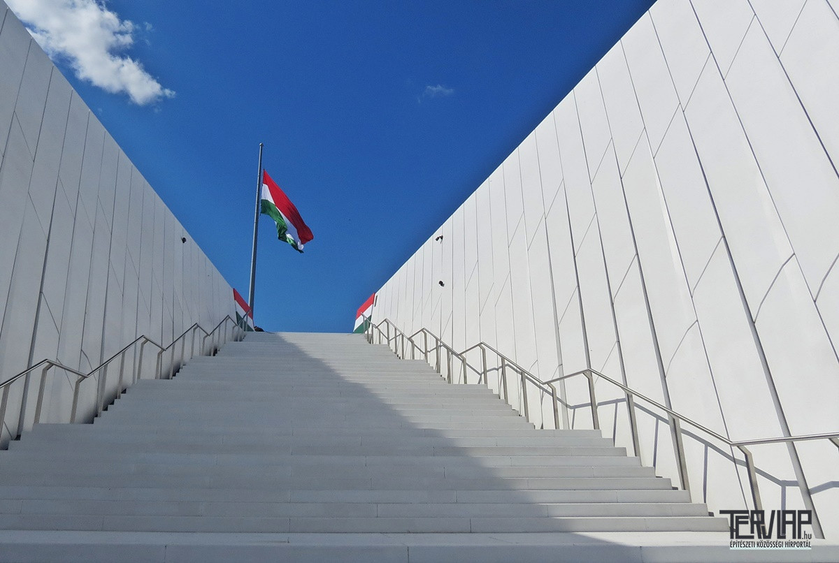A kiállítás különleges üvegszerkezetű fogadóterén átívelő, teljes egészében ragasztott üvegből készült gyalogoshíd nemcsak szerkezeti, de esztétikai szempontból is különlegesség, mivel itt az üveg, elsődleges teherhordó. Az üvegcsarnokot vizuálisan és tartalomvilágában is erősíti a mögötte elhelyezkedő, az egykori rondellaudvarban létrehozott feszített víztükör, amelynek középpontjában egy öröklángot helyeztek el. Az örökláng szimbolikusan tiszteleg a magyar történelem szabadságért küzdő hősei előtt.