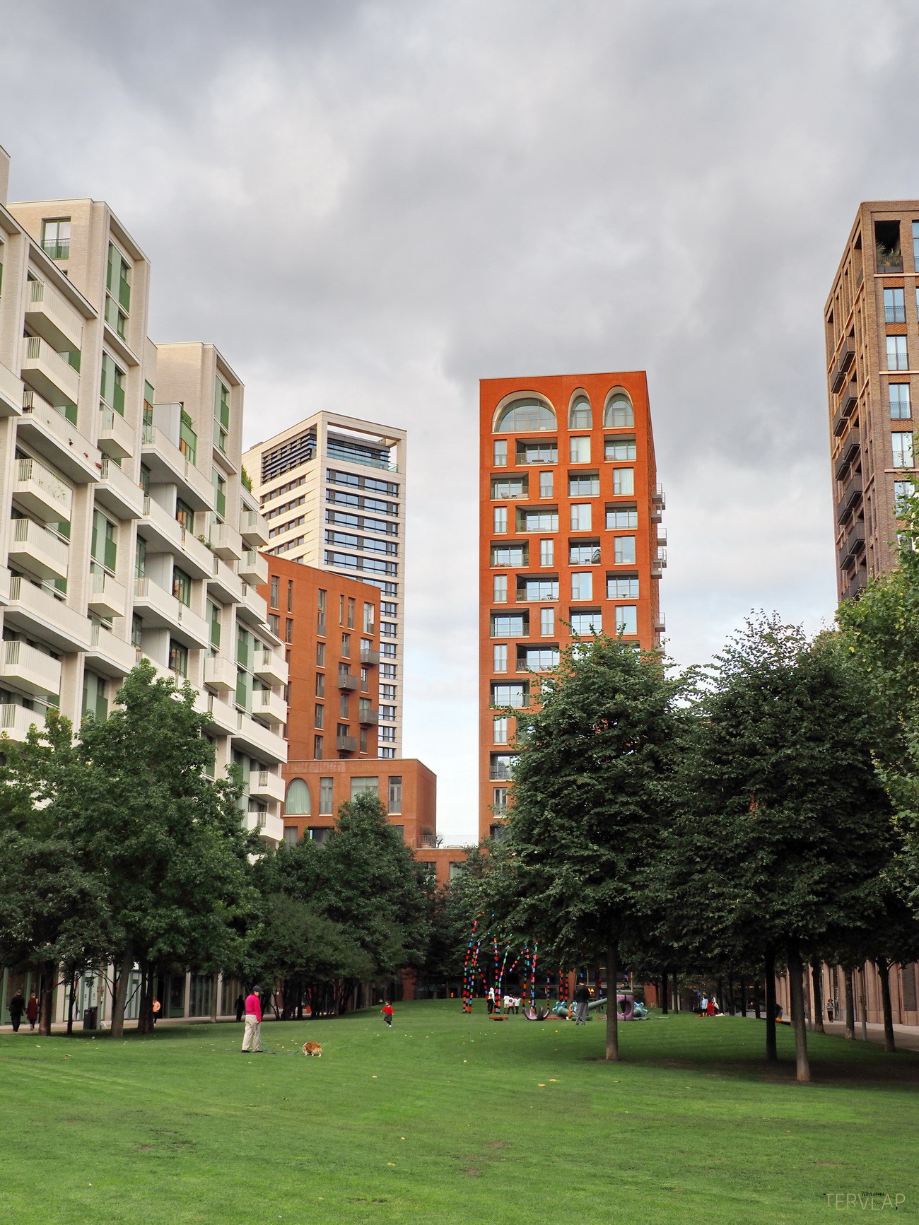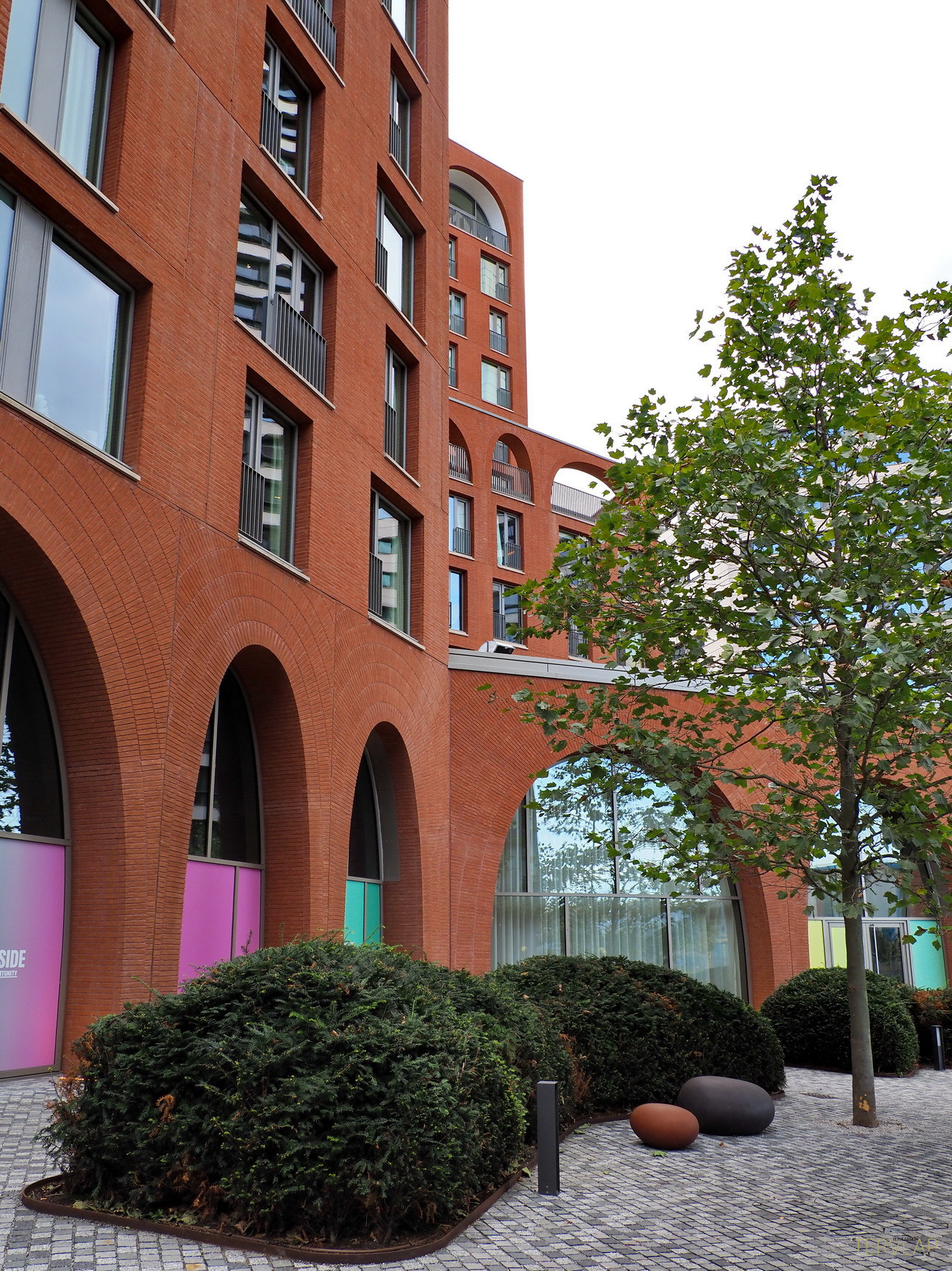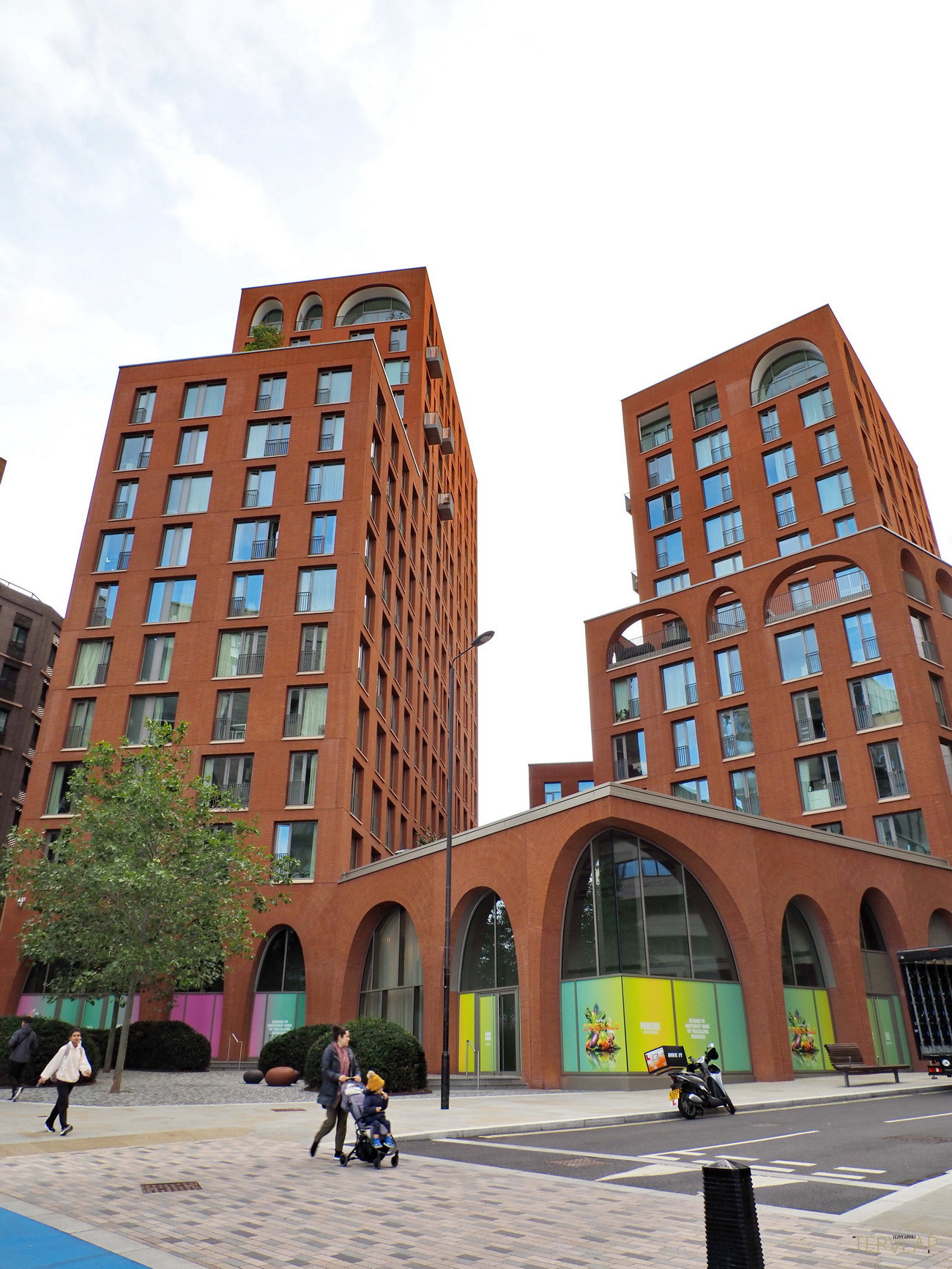 Egy hosszú park végén, tengelyben helyezkedik el Alison Brooks Architects épülete, amely éppen azt az elevenséget nyújtja, ami más épületekből hiányzik. Két vöröstéglás torony összekapcsolásával alakul ki az együttes: az egyik magas és központi elhelyezkedésű, míg a másik kissé eltolva és a megszokott derékszögekből kifordulva, ablakok és loggiák megtört ritmusával. A tetején és az alján, valamint egy-két helyen félúton szabálytalan ívsorok jelennek meg, amelyek parabola ívet követnek, így egyszerre ódon és jövőbeli, "Star Wars hangulatot" árasztanak.
