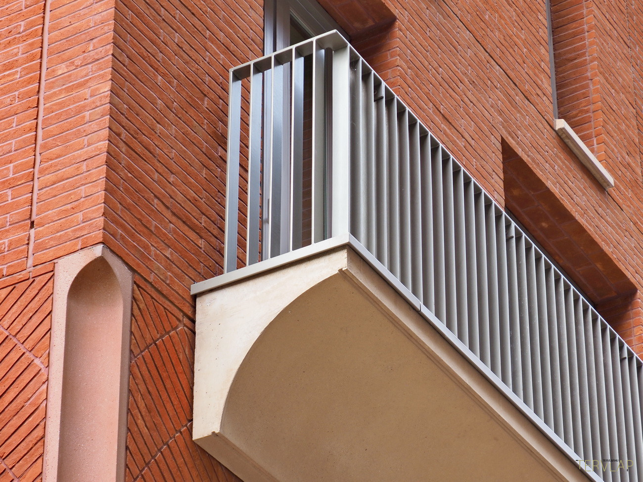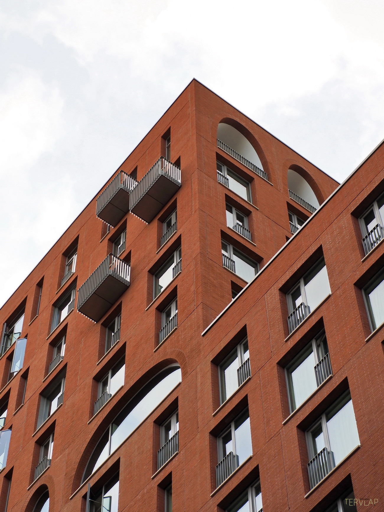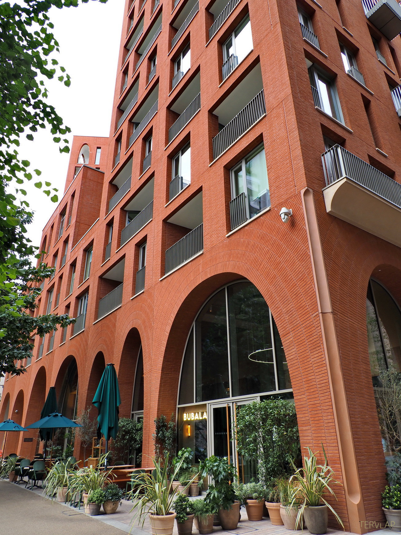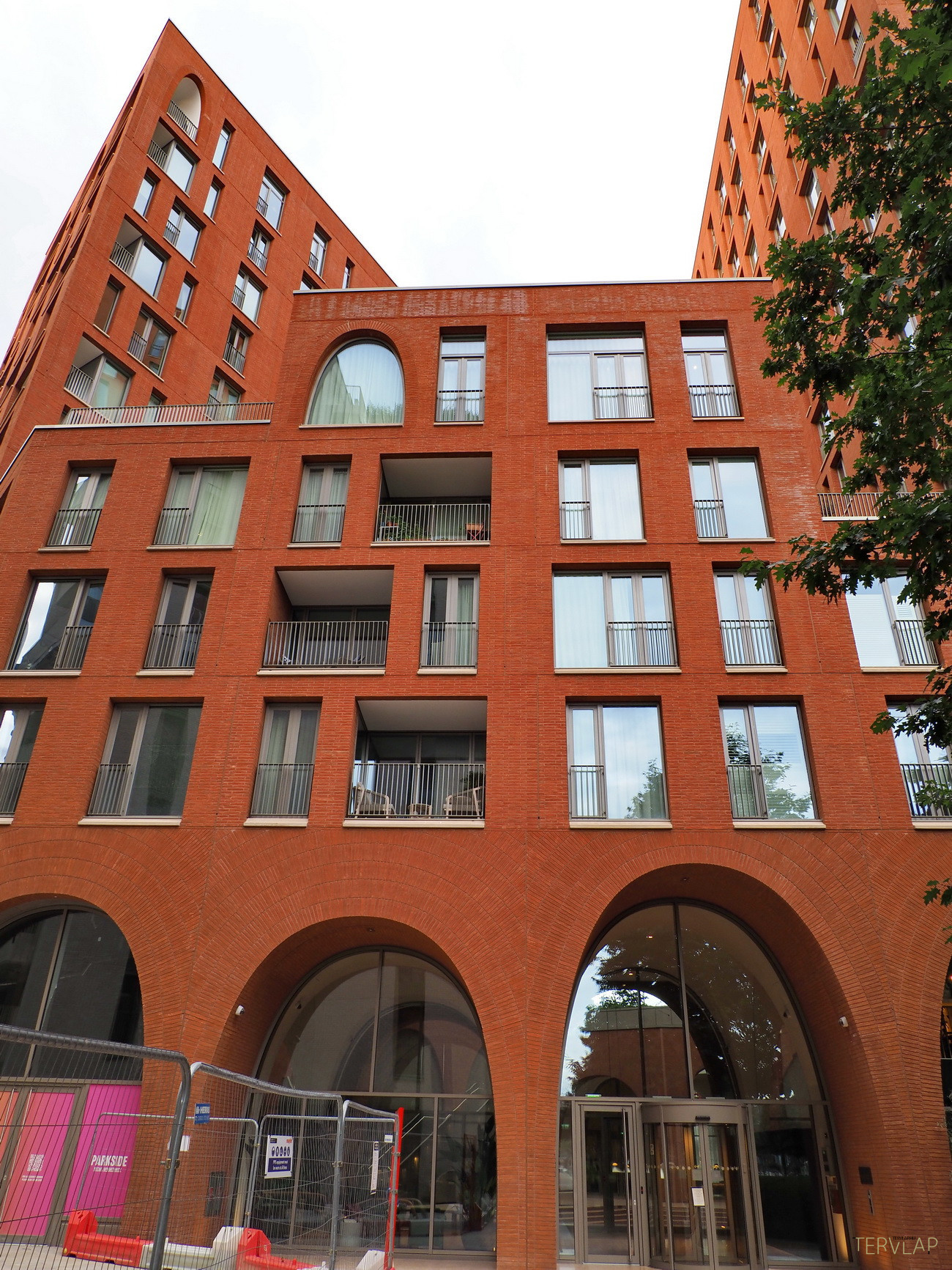Egy hosszú park végén, tengelyben helyezkedik el Alison Brooks Architects épülete, amely éppen azt az elevenséget nyújtja, ami más épületekből hiányzik. Két vöröstéglás torony összekapcsolásával alakul ki az együttes: az egyik magas és központi elhelyezkedésű, míg a másik kissé eltolva és a megszokott derékszögekből kifordulva, ablakok és loggiák megtört ritmusával. A tetején és az alján, valamint egy-két helyen félúton szabálytalan ívsorok jelennek meg, amelyek parabola ívet követnek, így egyszerre ódon és jövőbeli, "Star Wars hangulatot" árasztanak.
