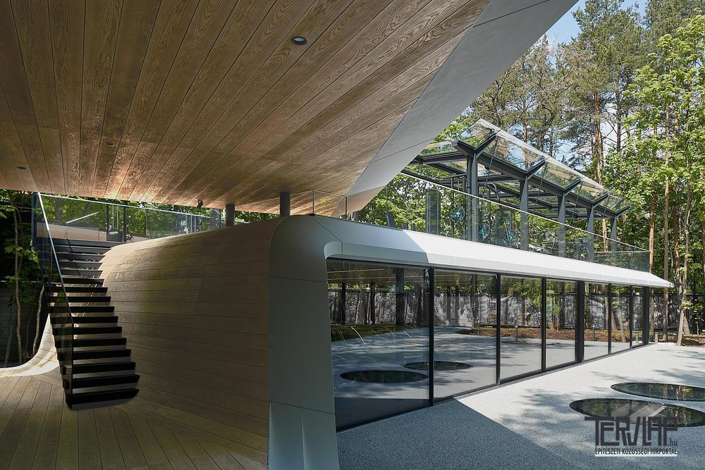A terv egy Möbius-szalag ihlette formából indul ki, amely körbefonódva keretezi az épületet, megőrizve minden meglévő fát. Ez a lendületes folytonos áramlás szervezi a funkciókat: a földszinten üvegezett kiállítóteret képez az autógyűjtemény számára, hosszanti irányban bejárati és hátsó teraszokat keretez. Átlósan megemelkedve egy tetőszinti szabadtéri edzőterülethez vezet. A föld alatt a tömeg egy edzőteremmel és irodával egészül ki, ahová a természetes fény diszkréten a külső terepbe rejtett bevilágítókon keresztül jut be.