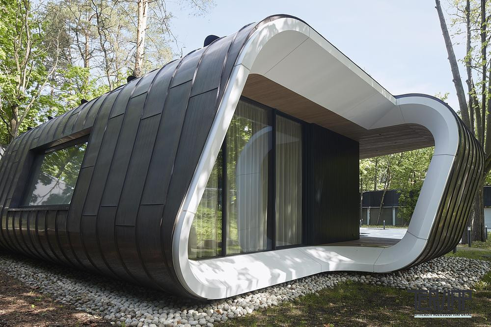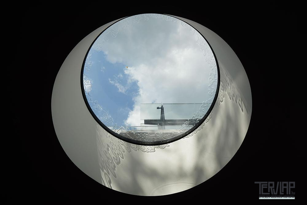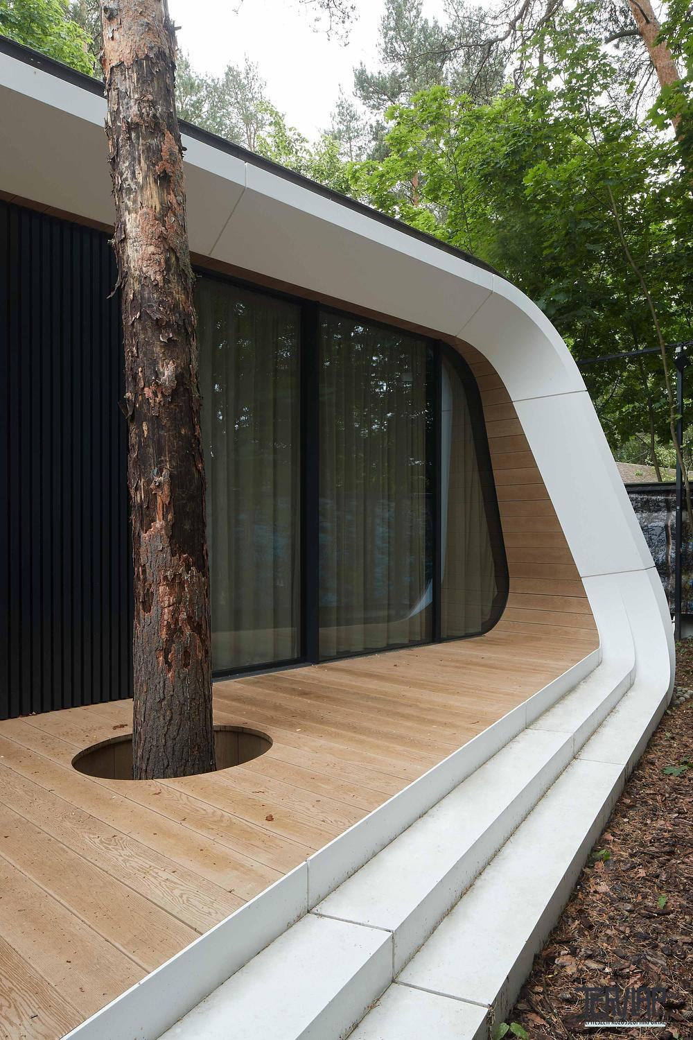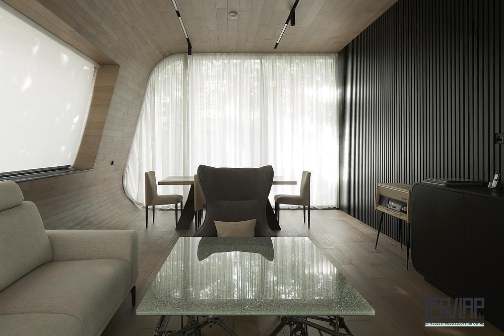 Az északi és déli oldalon alkalmazott, ultravékony profilú, nagyméretű üvegfelületek feloldják a belső tér és a táj közötti határt, ami erősíti a projekt természetbe való integrációját. Az illesztésmentes fehér Corian burkolat az autótervezés metaforája, aerodinamikus felületekre és precíz mérnöki megoldásokra utal, a belső térben megjelenő fa- és rézfelületek pedig melegséget és tapinthatóságot visznek az összképbe.