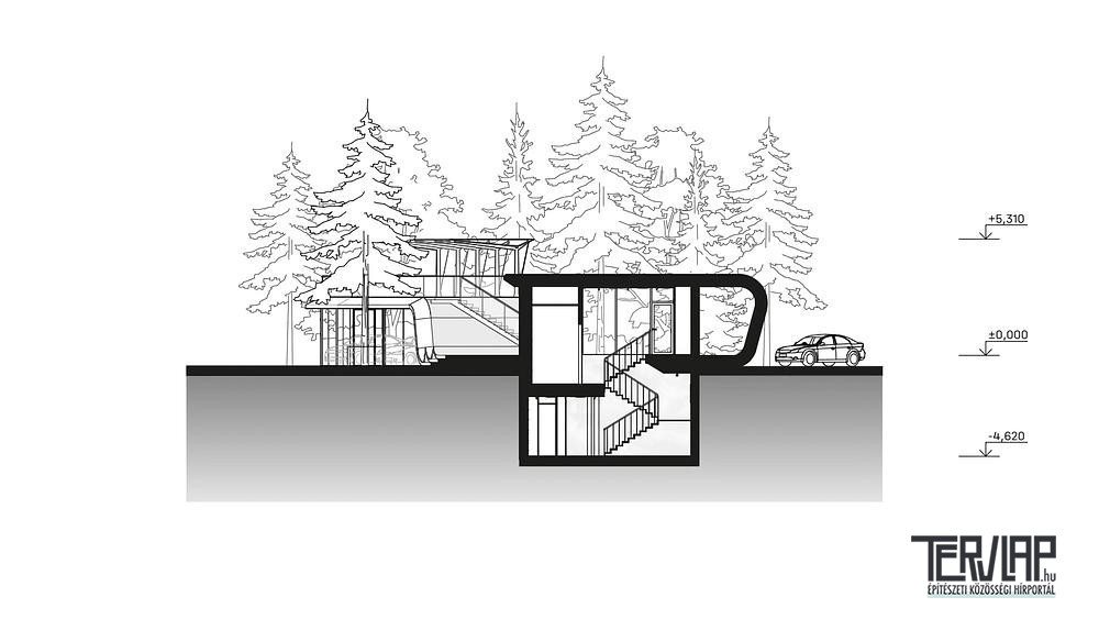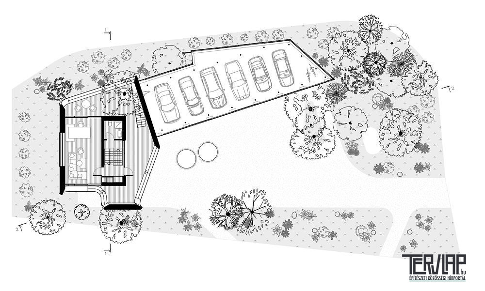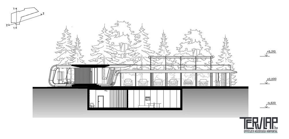 A garázs többfunkciós, közösségi eseményközpontként működik a magán ingatlanon belül. A földszint világos galériaként szolgál a járművek számára, közvetlen kapcsolattal az oda vezető felhajtóhoz. A felső terasz a fizikai aktivitás helyszíne, míg a föld alatti szint wellness- és adminisztratív funkciókat foglal magában. A szintek közötti közlekedés élményszerű, a mozgást és a tekintetet az épület szoborszerű logikája irányítja.