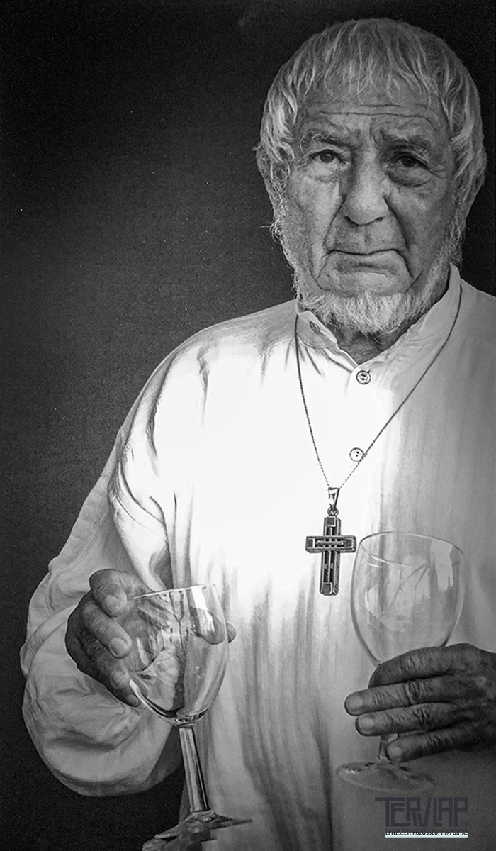 Ez a történet tökéletesen illeszkedik ahhoz a képhez, amit a fekete-fehér fotón közreadok. A pohár a kézben – nem egy hanem kettő! A nagy kereszt a mellkason. A képet Zsitva Tibor építész-fotográfus készítette én meg az Ő kiállításán a Fugában 2023-ban. Ez a portré képi összegzése mindannak, amit a visszaemlékezések elmondanak. Mesteriskolán mesterként ismertem meg, jókat beszélgettünk a mesteriskolás hétvégeken pohárral a kezünkben mindig borosüveg közelében. A könyv kapcsán rá emlékező családi-, baráti-, munkatársi esemény világítása, a borospohár vöröse, a sál a nyakban, az a bizonyos nagy kereszt – ezek mind ugyanahhoz az alakhoz tartoztak. Nem puszta attribútumok voltak, hanem egy karakter részei.