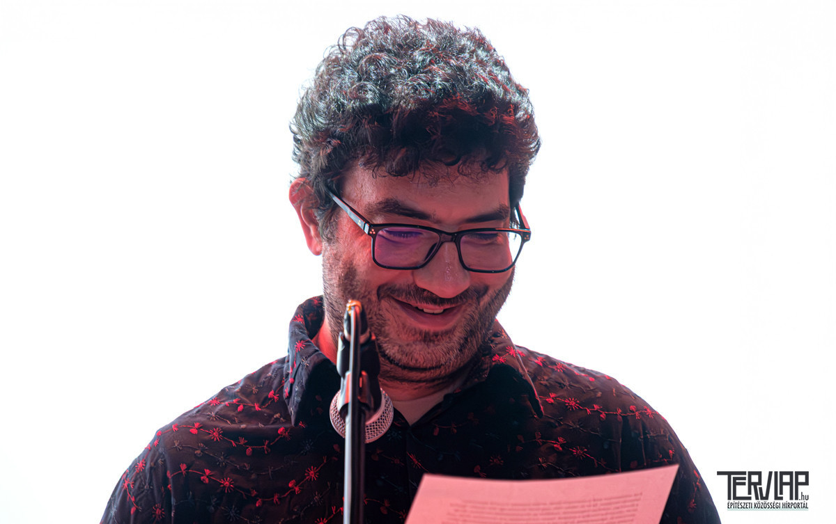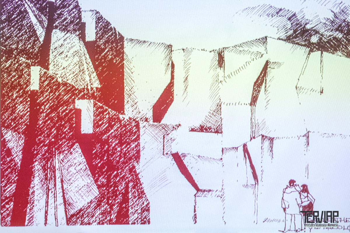 Fotóztam a kivetített rajzokat, mert a fényben másként élnek. A papír intimitása eltűnik, és helyette monumentális jelenlét lesz. Az egyik toronyszerű forma különösen megragad: mintha egyszerre lenne vár, templom és lakóház. Véd és hív. Határ és átjáró. Az egyik fotón egy ölelés látható. Számomra ez a kép lett a könyvbemutató igazi középpontja. Mert az építészet nála nemcsak forma volt, hanem kapcsolat. Emberek és terek között. Múlt és jelen között. Szakralitás és hétköznap között.
