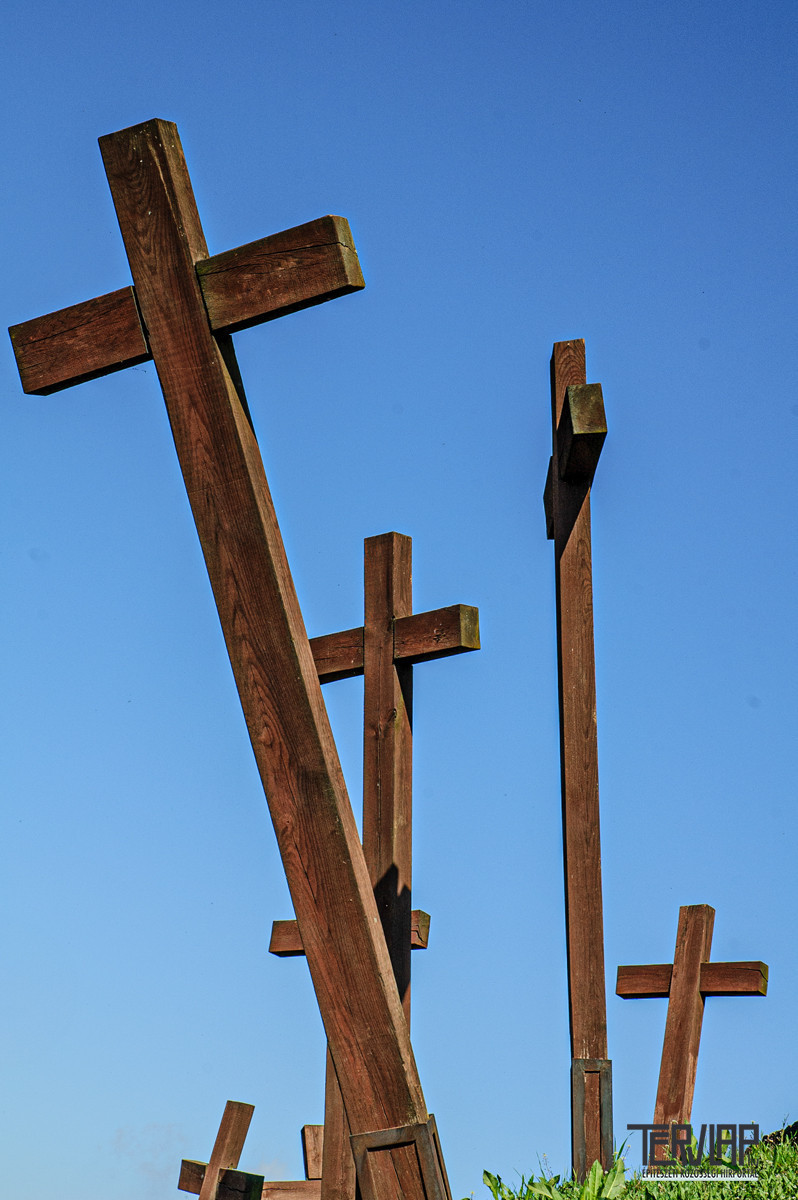 Kivetített rajzok a falon – vékony, határozott vonalak. A Vonal a legnagyobb csoda, így tartotta. A kivetítőn egymás után jelentek meg, ezek nem építészeti rajzok, ezek egy építész rajzai. Nem tudjuk, melyikből lett ház, nem tudjuk, lett-e belőlük ház egyáltalán. De azt tudjuk, hogy ezekben a vonalakban már ott van a tér, a hegy, a város, a kereszt, az ember. És talán nem is az a kérdés, mit inspiráltak, hanem az, hogy mit árulnak el arról, aki rajzolta őket. Néztem őket, és közben fényképeztem. Nem dokumentálni akartam, hanem érteni. A rajzokban ott volt az a különös feszültség, amit „Gyurma” alkotásaiban is mindig éreztem: egyszerre archaikus és modern, egyszerre szakrális és nagyon emberi. A keresztmotívumok – hol nyíltan, hol rejtetten – nem díszítőelemek voltak, hanem tengelyek. Tájolások. Erkölcsi irányok. A keresztekről készült képeim – domboldalon, ég felé fordulva – akaratlanul is visszautaltak rá. Arra a belső tartásra, amit az épületeiben is érezni. Nem hivalkodó, nem harsány – következetes. Szilárd.