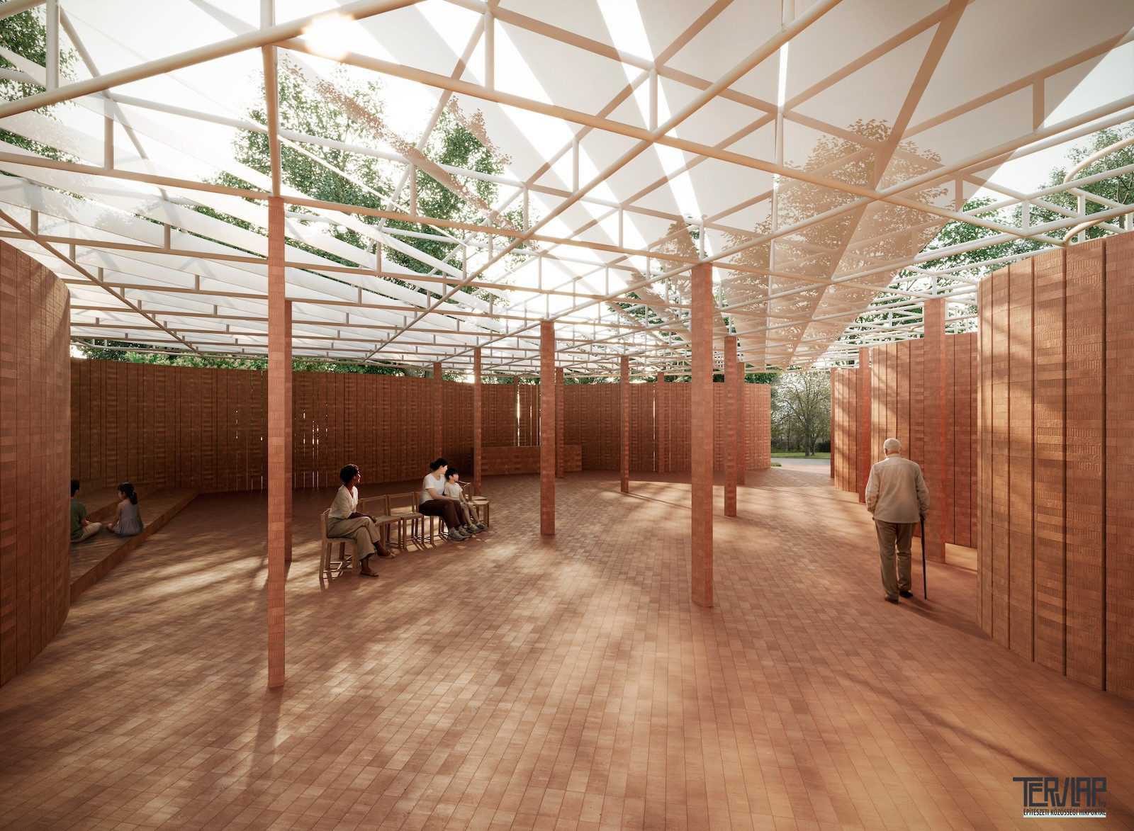 A 2026-os pavilon koncepcióját az angol „serpentine” (hullámzó) vagy „crinkle-crankle” fal néven ismert megoldásból merített inspirációt, amely egyszerre utal a történelmi építészeti megoldásokra és a közeli Serpentine-tó kígyózó formájára. A váltakozó ívekből álló téglafaltípus az ókori Egyiptomból származik, és később holland mérnökök vezették be Angliában. Kanyargó formája az oldalirányú megtámasztás révén biztosít stabilitást, vagyis az egy tégla vastagságú serpentin fal kevesebb téglát igényel, mint egy egyenes fal. A pavilon áttetsző tetővel és téglapillérek „ligetével” épül, hogy a fény és a levegő szabadon áramolhasson, elmosva a határt a zárt és nyitott tér között. A téglaanyag egyszerre tiszteleg az angol kertépítészeti hagyomány előtt és hidat képez Európa és Amerika építészeti kultúrái között.