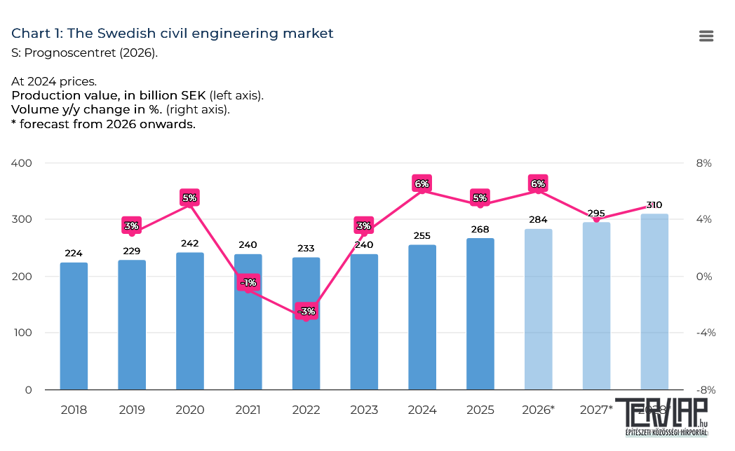 2023 óta a mélyépítési beruházások, felújítás és karbantartás is folyamatosan bővül, ami jelzi, hogy ez a piac nem annyira érzékeny a gazdasági ciklusokra, mint a lakó- és kereskedelmi ingatlanok új építése és felújítása. Ez nagyrészt annak köszönhető, hogy a finanszírozás főleg az állami szektorból vagy egy monopolpiac díjaiból származik. Az erős államháztartás miatt Svédország tud új infrastruktúrát építeni, karbantartási adósságot fizetni, annak ellenére, hogy az építési költségek az elmúlt években jelentősen megnőttek. És kell is hisz az elhasználódott utak, a túlzsúfolt vasutak és az elavult víz- és csatornahálózatok miatt a karbantartást már nem lehetett tovább odázni. A védelem, az éghajlatváltozás és az ipari terjeszkedés növekvő igényeivel együtt ez most példátlan állami beruházási hullámot idézett elő, mely az összes infrastrukturális szegmensben egyszerre zajlik: