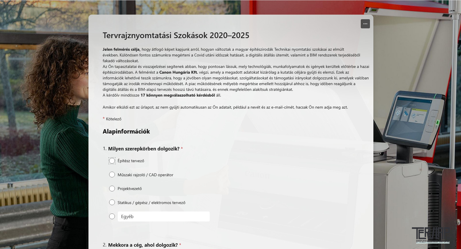 Az Ön tapasztalatai és visszajelzései segítenek abban, hogy pontosan lássuk, mely technológiák, munkafolyamatok és igények kerültek előtérbe a hazai építészirodákban. A felmérést a Canon Hungária Kft. végzi, amely a megadott adatokat kizárólag a kutatás céljára gyűjti és elemzi. Ezek az információk lehetővé teszik számunkra, hogy a jövőben olyan megoldásokat, szolgáltatásokat és támogatási irányokat dolgozzunk ki, amelyek valóban támogatják az irodák mindennapi működését. A piac működésének mélyebb megértése emellett hozzájárul ahhoz is, hogy időben reagáljunk a digitális átállás és a BIM‑alapú tervezés hosszú távú hatásaira, és ennek megfelelően alakítsuk stratégiánkat.