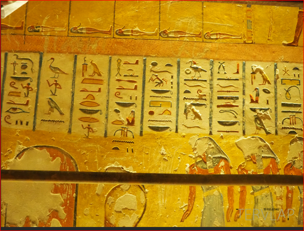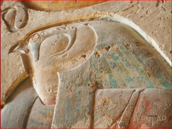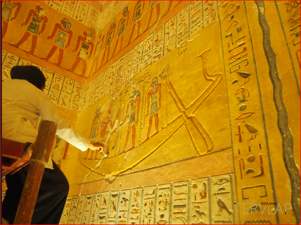 A fáraó- és Hórusz-ábrázolások, a hieroglifák mind-mind tipikusnak mondható egyiptomi motívumok, de ezek a világító, élénk színek olyanok, mintha csak tegnap festette volna fel őket a művész. A képek karbantartása folyamatosan zajlik: ottjártunkkor is láttuk, ahogy állványokról apró ecsetekkel portalanítják a képeket, hogy azok megőrizzék frissességüket.