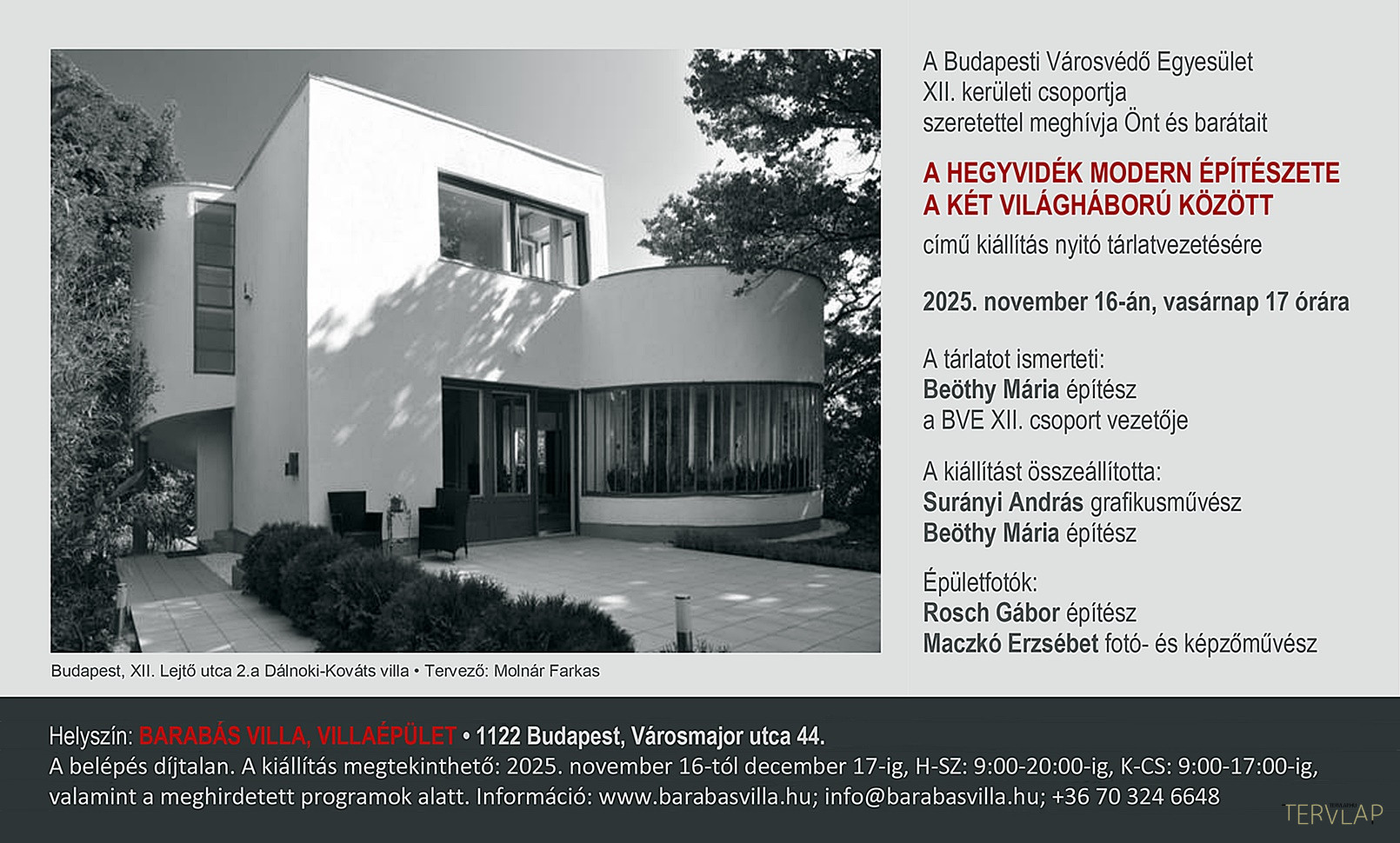 A Hegyvidék modern építészete a két világháború között című kiállítás következő helyszíne a Barabás-villa. A kiállítást a Budapesti Városvédő Egyesület 12. kerületi csoportja állította össze, Beöthy Mária építész, a BVE 12. csoport vezetője és Surányi András grafikusművész. Épületfotók: Rosch Gábor építész és Maczkó Erzsébet fotóművész